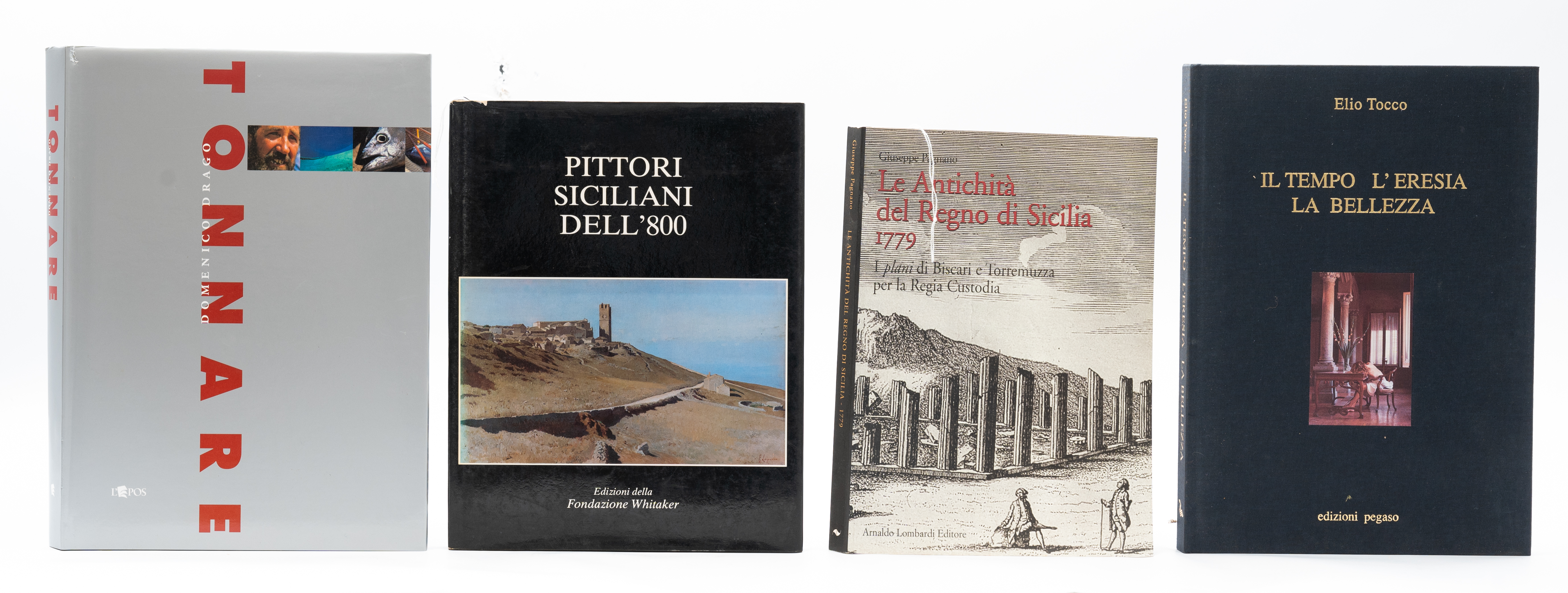QUATTRO VOLUMI D’ARTE SULLA SICILIA: 1) Domenico Drago TONNARE, ed. l’Epos 1999. Testi di Giampiero Finocchiaro, prefazione di Folco Quilici, introduzione di Renato Tomasino. Il volume raccoglie gli straordinari scatti che ritraggono la mattanza siciliana, ritratti di uomini e di scene della pesca del tonno svolta nelle tonnare di Bonagia, Favignana e Scopello. Legatura editoriale rigida con sovracoperta illustrata. Cm 34 x 24. Pp. 271 con illustrazione a colori. 2) Giuseppe Pagnano LE ANTICHITÀ DEL REGNO DI SICILIA 1779. I PLANI DI BISCARI E TORREMUZZA PER LA REGIA CUSTODIA, ed. Arnaldo Lombardi Editore 2001. Brossura editoriale figurata. In ottime condizioni. Cm 21 x 29. Pp. 280 con illustrazioni in b/n e a colori. 3) Elio Tocco IL TEMPO L’ERESIA LA BELLEZZA, ed. Pegaso 1991. Legatura editoriale in tela nera con titoli in oro al piatto e al dorso. Fotoapplicazione al piatto anteriore. L’opera di uno dei più raffinati, profondi e disillusi uomini di cultura siciliani contemporanei. Cm 31 x 24. Pp. 230. 4) Irma Mattarella PITTORI SICILIANI DELL’800, ed. Fondazione Whitaker 1982. In 4 (cm 24 x 30), pp. 30 con 125 tavole con riproduzioni di opere a colori. Interamente stampato su pagine di carta patinata. Legatura editoriale in tela con sovraccoperta illustrata. Catalogo della mostra svoltasi presso la Fondazione Whitaker di Palermo nel 1982.