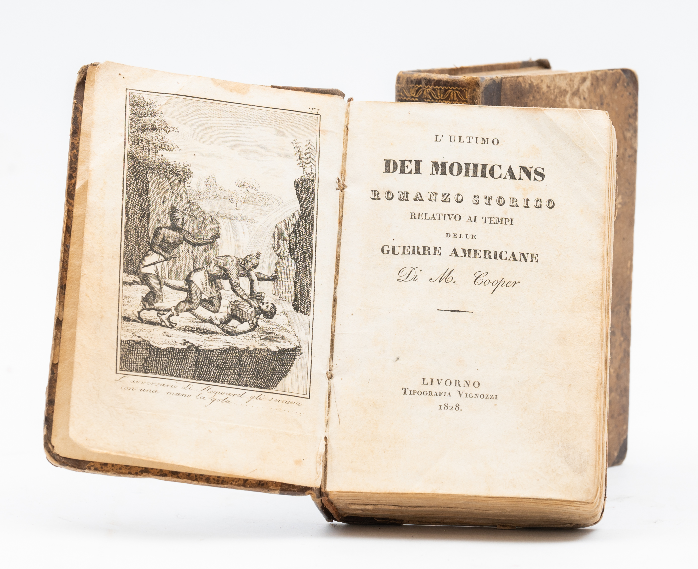 DUE OTTOCENTINE IN 16° di James Fenimore Cooper L’ULTIMO DEI MOHICANS, ed. Livorno Vignozzi 1828 - 1829. 2 tomi che contengono cinque libri. Legatura coeva in mezza pelle bruna, titolo e fregi impressi in oro ai dorsi. Con 5 incisioni xilografiche alle antiporte. Pp. 917 continuative. Il 1828 è l'anno in cui uscì la prima edizione italiana de "L'ultimo dei Mohicani". Molto raro.