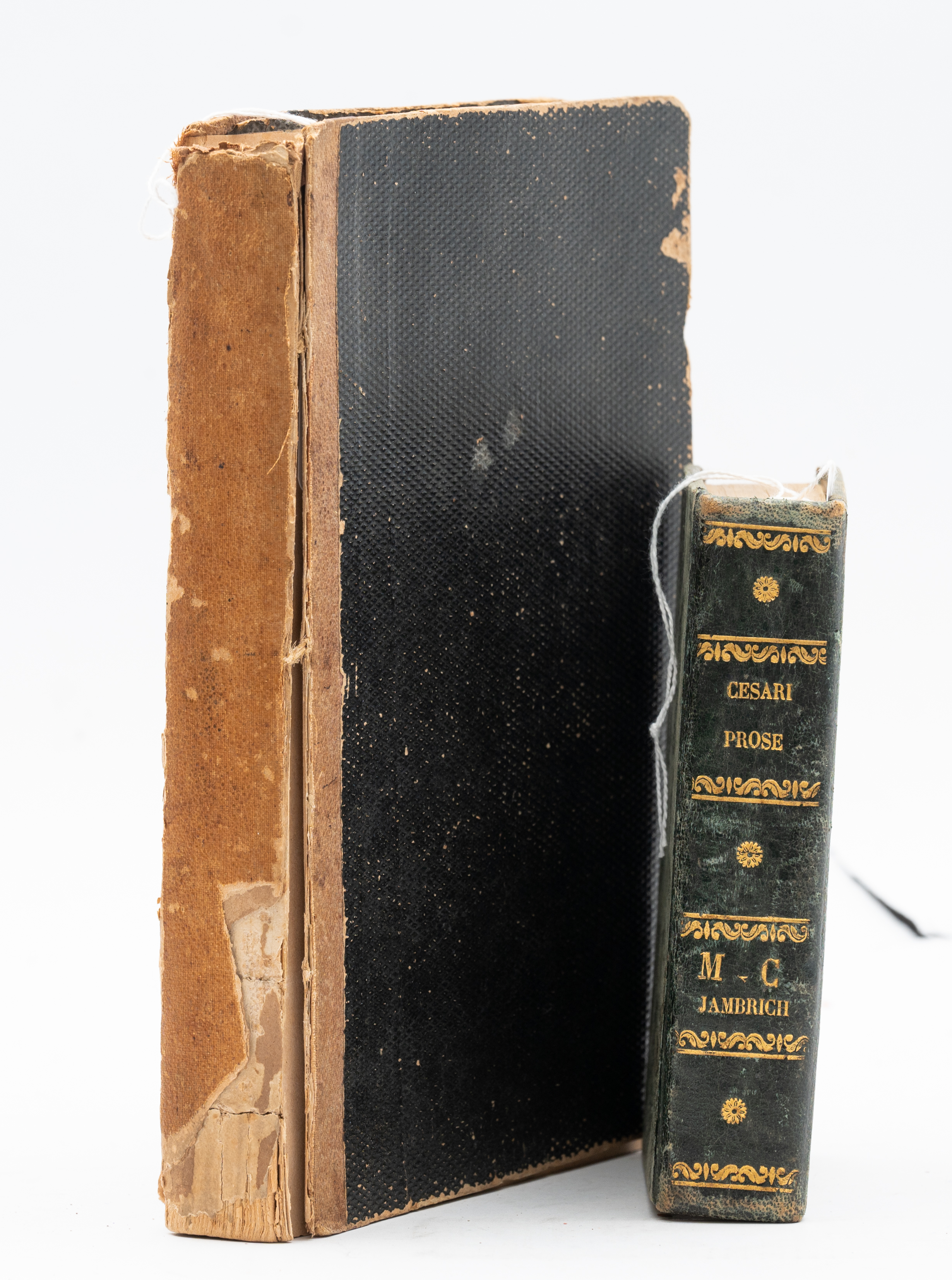 DUE OTTOCENTINE DI VARIA PUBBLICATE IN SICILIA: 1) Antonio Cesari PROSE SACRE, ed. Messina, Stamperia Pappalardo 1832. In 16°. Un tomo che racchiude tre parti. Legatura coeva in mezza pelle con piatti in percallina rigida. titoli, fregi, filetti e iniziali di appartenenza impressi in oro al dorso. segni m. s. di appartenenza al frontespizio. Volume in più che discrete condizioni. Pp. 193, (4); 166; 190, (4). 2) POESIE DI GIOVANNI MELI CON L’AGGIUNTA DI POESIE INEDITE PER LA PRIMA VOLTA PUBBLICATE, ed. Palermo, Gaudiano 1874. In 8°. Rilegatura coeva rigida muta. Pagine in più che discrete condizioni. Stampato su due colonne. Pp. 486.