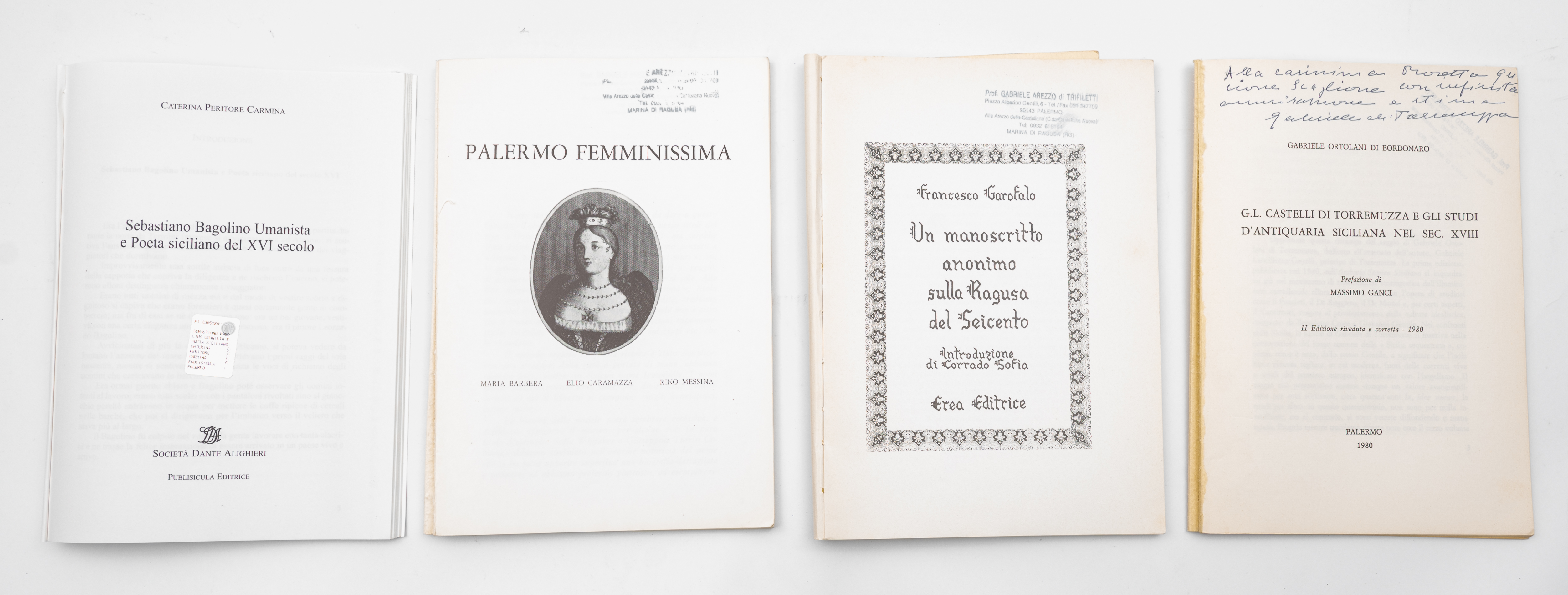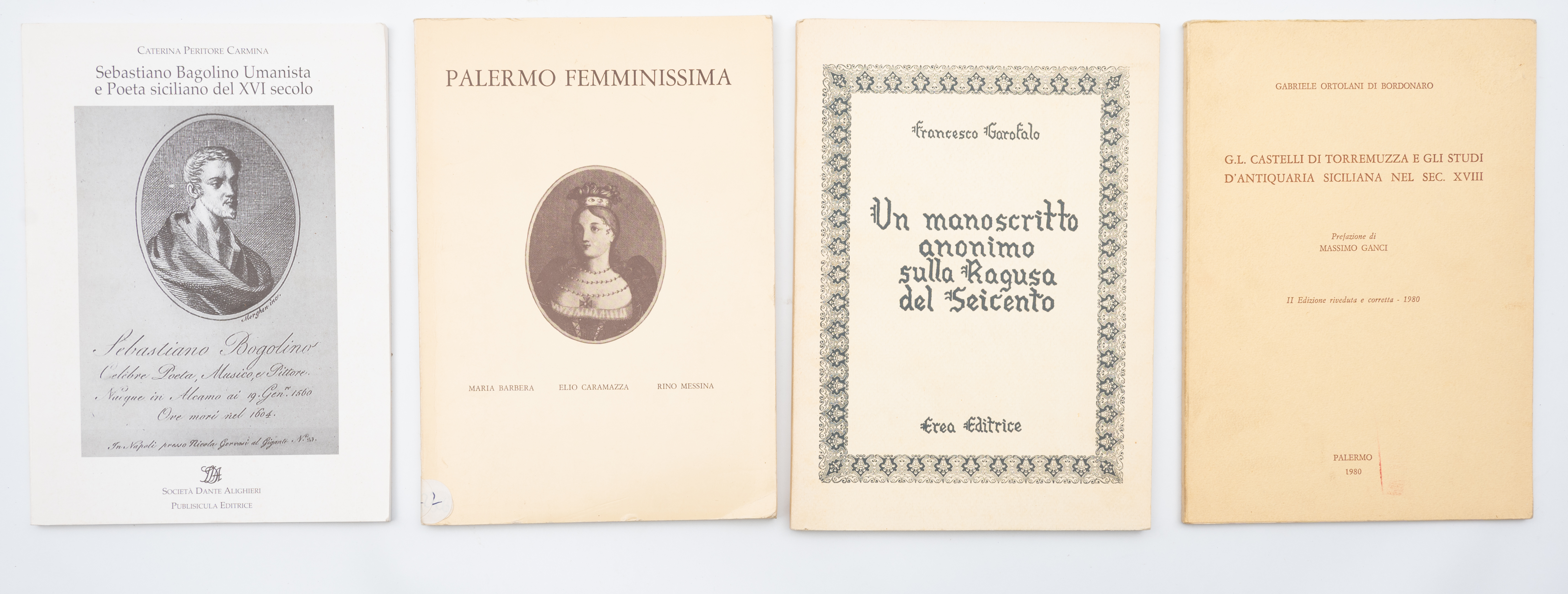 QUATTRO OPUSCOLI DEL XX SECOLO SULLA SICILIA: 1) Caterina Peritore Carmina SEBASTIANO BAGOLINO UMANISTA E POETA DEL XVI SECOLO, ed. Società Dante Alighieri / Publisicula 2004. In 8°. Brossura editoriale figurata. In perfette condizioni. Pp. 60. 2) Maria Barbera / Elio Caramazza / Rino Messina PALERMO FEMMINISSIMA, ed. Palermo 1981. In 8°. Brossura editoriale figurata. In perfette condizioni. Pp. 83, con una tavola più volte ripiegata f. t. 3) Gabriele Ortolani di Bordonaro G. L. CASTELLI DI TORREMUZZA E GLI STUDI DI ANTIQUARIA SICILIANA NEL SEC. XVIII, ed. Palermo 1980. Con dedica autografa dell’autore. In 8°. Brossura editoriale. In perfette condizioni. Pp. 67. 4) Francesco Garofalo UN MANOSCRITTO ANONIMO SULLA RAGUSA DEL SEICENTO, ed. Erea Editrice 1980. In 8°. Brossura editoriale. In perfette condizioni. Pp. 102.