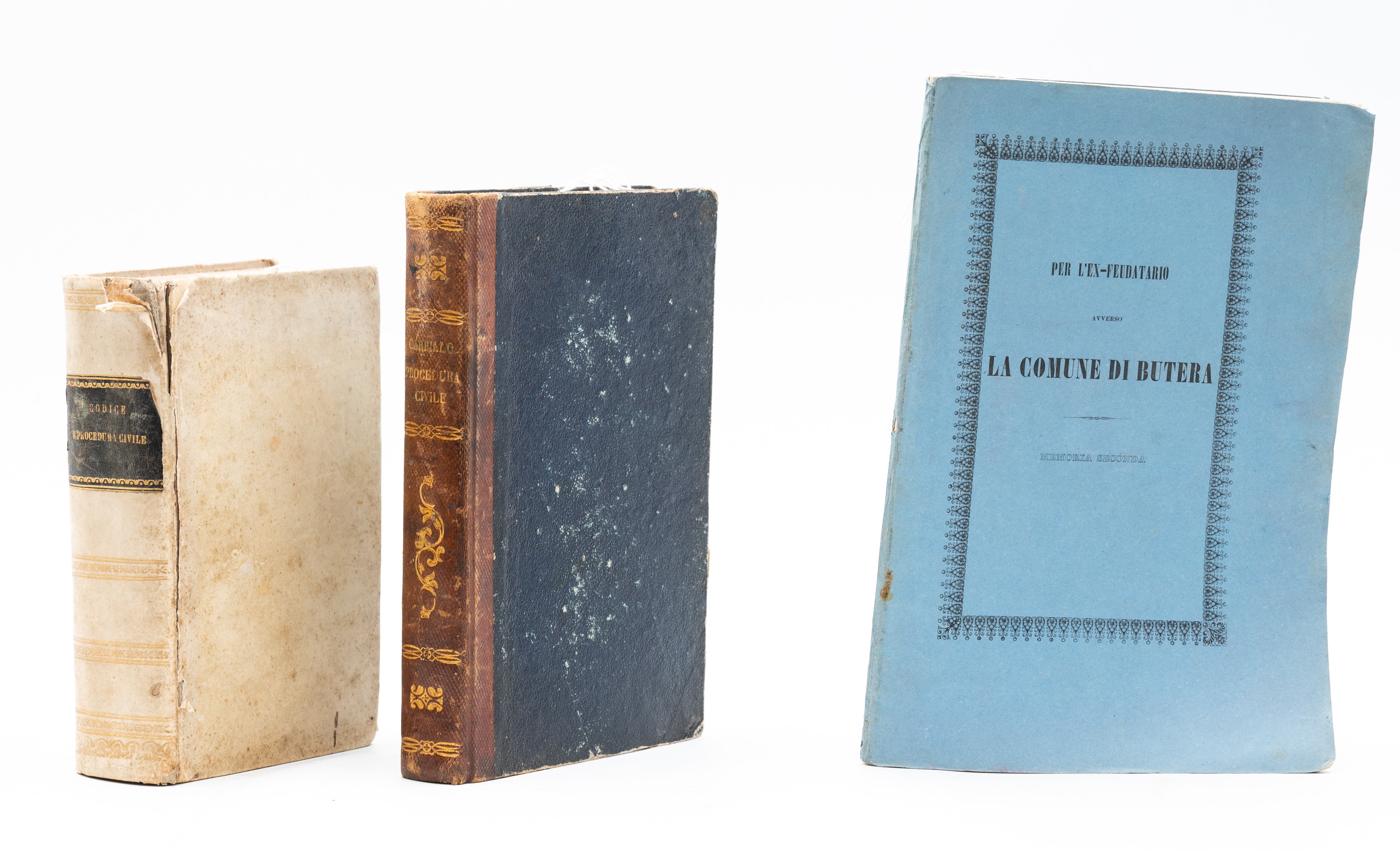 DUE VOLUMI ED UN OPUSCOLO DI DIRITTO DEL XIX SECOLO PUBBLICATI A PALERMO: 1) Filippo Carrillo FORMOLE DEGLI ATTI PIU’ IMPORTANTI DELLA PROCEDURA CIVILE …. , ed. Palermo, Tipografia Reale di Guerra 1819. Raro. In 8° piccolo. Legatura coeva in mezza pelle con piatti in percallina rigida. Titolo e fregi in oro al dorso. volume con qualche gora ma in generale in buone condizioni. Pp. 375. 2) CODICE CIVILE DEL REGNO D’ITALIA COL CONFRONTO DEL CODICE NAPOLEONE E DELLE LEGGI CIVILI DEL GIA’ REGNO DELLE DUE SICILIE, ed. Palermo, Pedone Lauriel e C. 1865. In 16°. Legatura in piena pergamena, titolo entro tassello e filetti in oro al dorso. tagli spruzzati. Pp. 309. 3) PER L’EX FEUDATARIO AVVERSO LA COMUNE DI BUTERA, ed. Palermo, Poligrafia Empedocle 1842. In 8°. Brossura editoriale. Piccola gora al taglio ma opuscolo in ottime condizioni. Pp. 49.