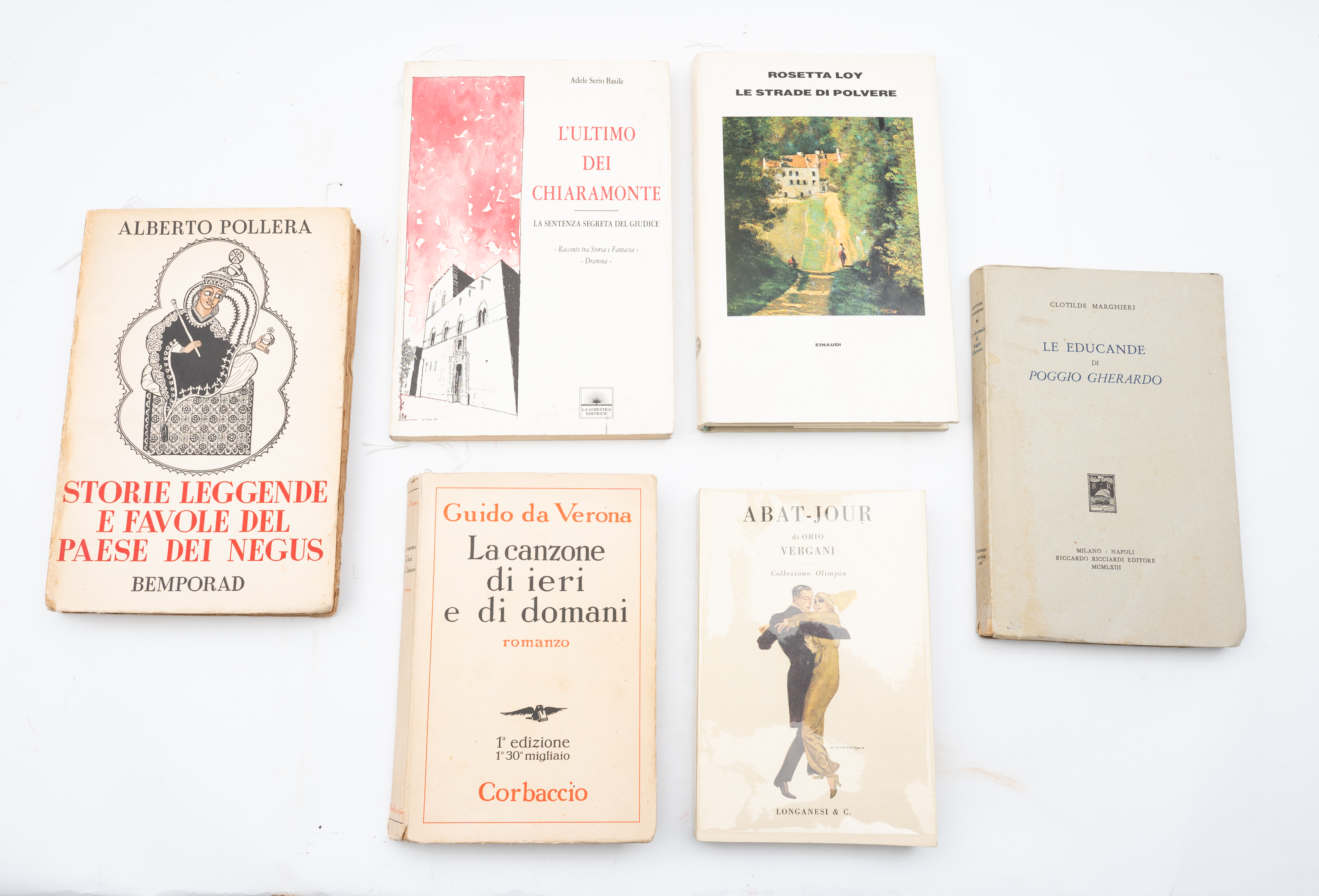 SEI VOLUMI DI LETTERATURA DEL XX SECOLO IN 1^ EDIZIONE: 1) Alberto Pollera STORIE LEGGENDE E FAVOLE DEL PAESE DEL NEGUS, ed. Firenze, R. Bemporad e F. 1936. Con 26 illustrazioni fuori testo. In 8°. Brossura editoriale figurata. Tagli irregolari. Volume in ottime condizioni con pagine ancora intonse. Pp. 243, (2). 2) Clotilde Margheri LE EDUCANDE DI POGGIO GHERARDO, ed. Milano – Napoli Riccardo Ricciardi 1963. Brossura editoriale con ali, figurata e marginosa. Tagli irregolari. Volume in ottime condizioni. Clotilde Marghieri (Napoli, 1897 – Roma, 1981) è stata una scrittrice italiana. Con questo volume si è aggiudicata il Premio Letterario Sebeto per le opere prime. Pp. 167. 3) Orio Vergani ABAT – JOUR, ed. Milano, Longanesi e C. 1973. In 16° grande. Brossura editoriale con acetato protettivo editoriale. Volume in perfette condizioni. Pp. 275, (12). 4) Guido da Verona LA CANZONE DI IERI E DI DOMANI, ed. Milano, Corbaccio 1932. Brossura editoriale. Tagli marginosi. Volume in ottime condizioni. Pp. 304. 5) Rosetta Loy LE STRADE DI POLVERE, ed. Einaudi 1987. In 8°. Legatura editoriale con sopracoperta editoriale illustrata. Pp. 240, (10). Con questo volume Rosetta Loy si è aggiudicata nel 1988: il Premio Campiello, il Premio Viareggio, il Premio Catanzaro e il Premio Rapallo Carige. 6) Adele Serio Basile L’ULTIMO DEI CHIARAMONTE, ed. Palermo, La Ginestra 1992. In 8°. Brossura editoriale figurata con ali. Volume in ottime condizioni con pagine pulite e ben tenute. Pp. 174.