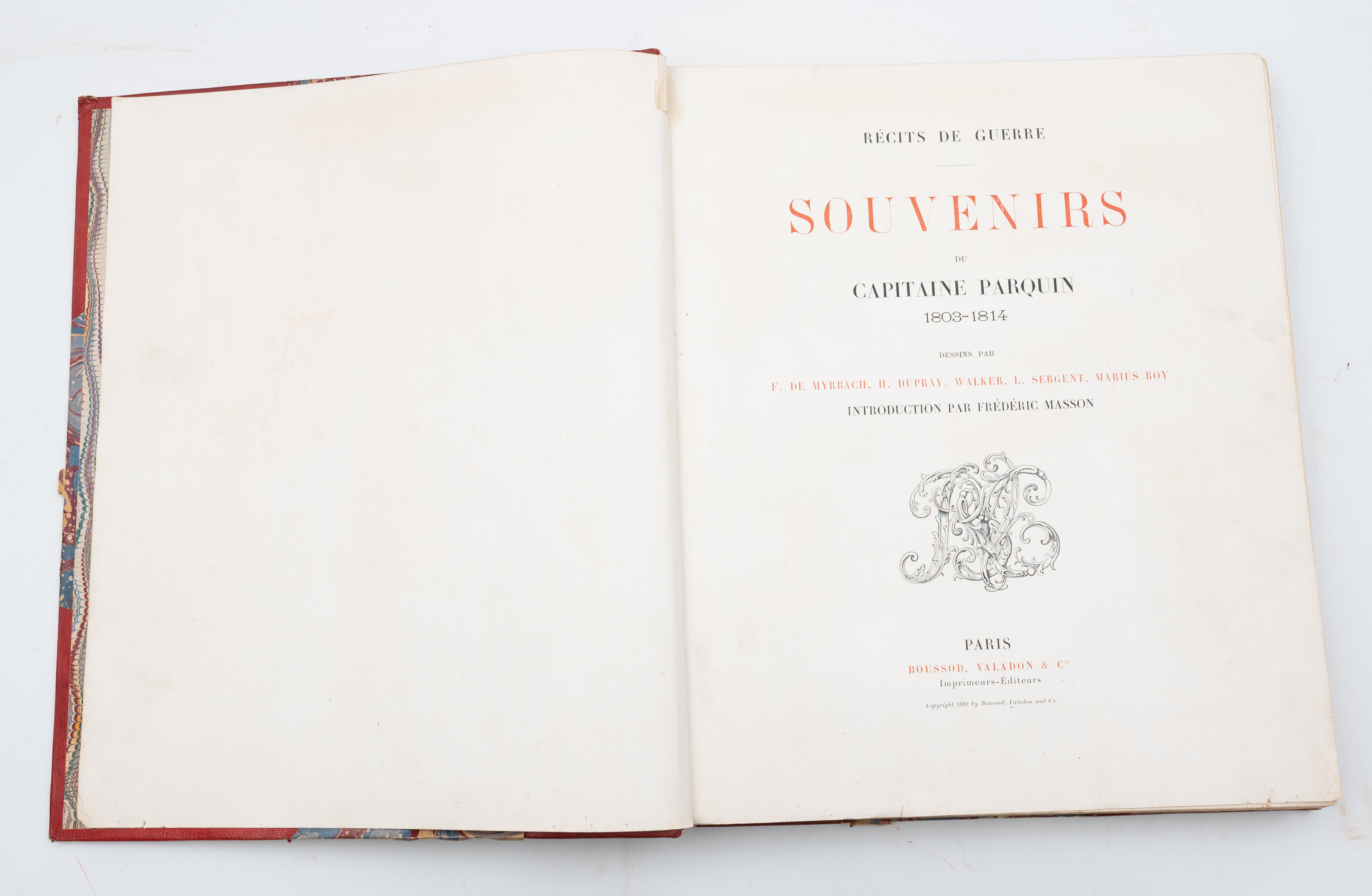 OTTOCENTINA IN FOLIO: RECIT DE GUERRE. SOUVENIR DU CAPITAINE PARQUIN 1803 – 1814, ed. Paris, Boussod, Valldon et C. 1892. Prima edizione illustrata. Rilegata in modo splendido in legatura editoriale in mezzo marocchino rosso con angoli e piatti marmorizzati. nervature, titoli e fregi in oro al dorso. risguardi marmorizzati, bordo superiore dorato. Pagine pulite e ben tenute. Disegni di F. De Myrbach, H. Dupray, Walker, L. Sergent, Marius Roy. Introduzione di Frederic Masson. stampato su carta patinata pesante, illustrato con 43 tavole a tutta pagina - 20 a colori (quattro delle quali a doppia pagina), 23 in bianco e nero (otto delle quali a doppia pagina), più numerose illustrazioni in bianco e nero all'interno del testo. Pp. 168.