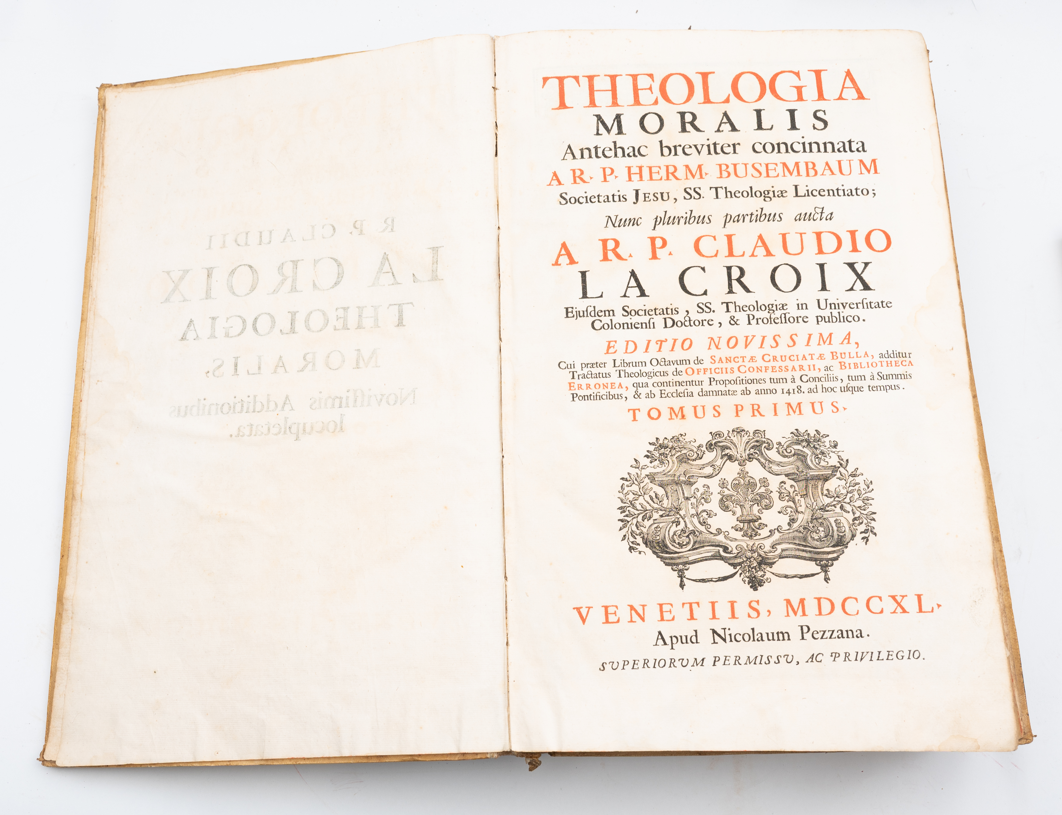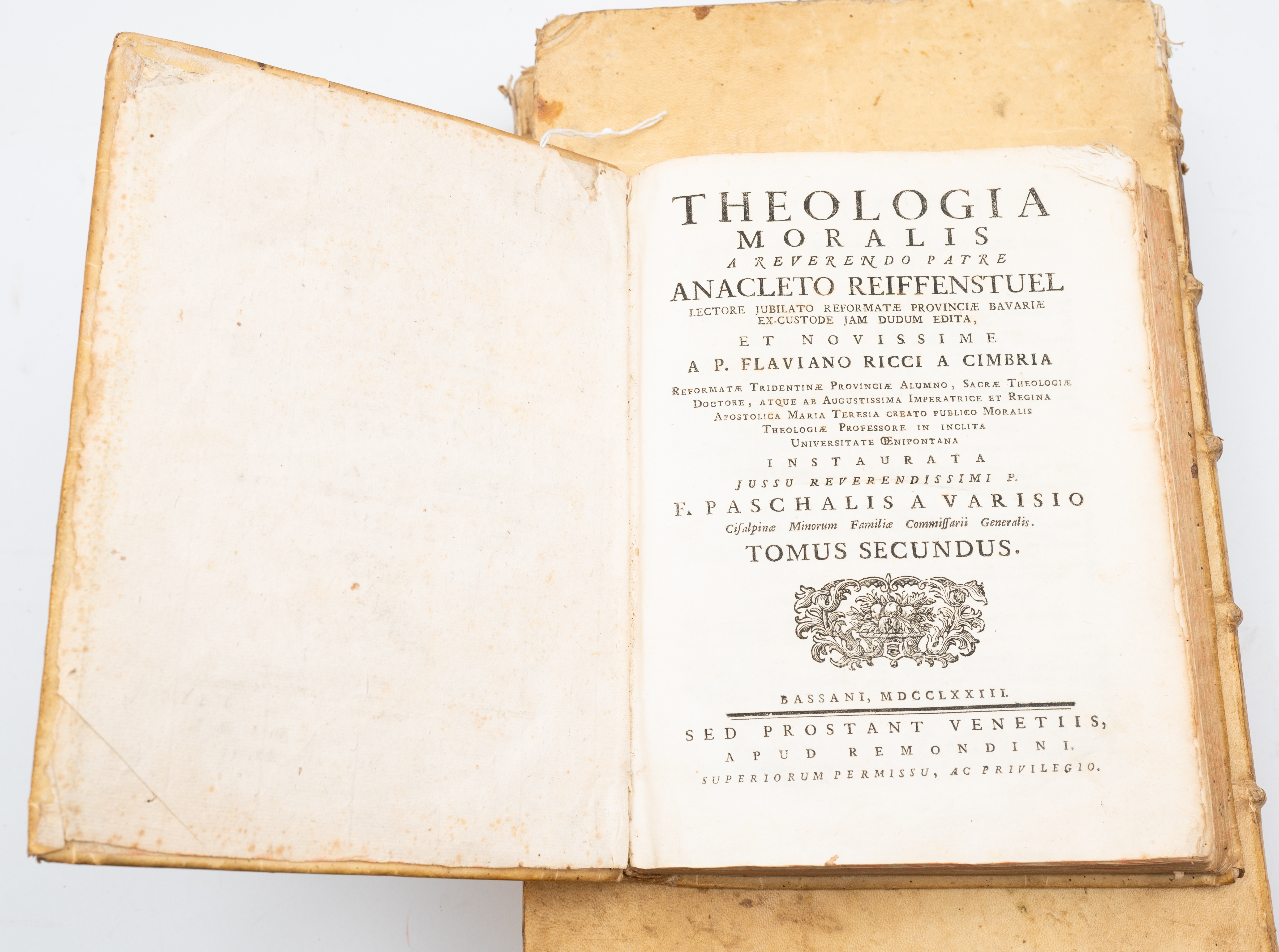 CINQUE SETTECENTINE DI TEOLOGIA: 1) Honoratus Tournely PRAELECTIONES THEOLOGICAE DE SACRAMENTO ORDINIS e PRAELECTIONES THEOLOGICAE DE SACRAMENTO MATRIMONII, ed. Venetiis, Apud Nicolaum Pezzana MDCCXXXI., ed. In 8°. Legatura coeva in cartonato rustico muto. Le due opere rilegate insieme, presentano pagine pulite e ben tenute ancora fragranti. Testatine finemente incise. In antiporta ex libris manoscritto del Vescovo di Cagli e Pergola Carlo Monti (fu Vescovo dal 25 maggio 1818 al 7gennaio 1842). Honoré Tournély (1658 – 1729) è stato un teologo francese. Conseguito il dottorato in teologia e filosofia alla Sorbona, insegna poi all'Università di Douai, istituita nel 1562 da re Filippo II per contrastare la Riforma protestante. Fermo oppositore del giansenismo, fa rientro a Parigi per la docenza di teologia, che conserva per un quarto di secolo ove pubblica le sue lezioni accademiche come "Praelectiones theologicae". Pp. ( 16), 360; 299. 2) Claudio La Croix "THEOLOGIA MORALIS ANTEHAC BREVITER CONCINNATA AR. P. HERM. BUSEMBAUM SOCIETATIS JESU, SS. THEOLOGIAE LICENTIATO; NUNC PLURIBUS PARTIBUS AUCTA AR. P. CLAUDIO LACROIX….", editio novissima, Venetiis apud Nicolaum Pezzana 1740. 2 volumi in folio. Questi volumi del La Croix vertono sull’opera di Hermann Busembaum che fu un insigne teologo morale (1600 - 1668) i cui insegnamenti e le cui pubblicazioni di Teologia Morale vennero diffusi in tutti i principali centri di dottrina cattolica per oltre 200 anni. La sua principale opera venne successivamente ampliata da Claudio Lacroix nella presente pubblicazione. Legatura in piena pergamena, belle nervature, fregi e titoli in oro incisi ai tasselli e al dorso. Tomo I frontespizio bicromia. Belle testatine incise. Capilettera e finalini artistici. Belle incisioni all’acquaforte all’interno. Praefatio ; I – LVI introduzione e indice; 476 pagg.; Tomo II frontespizio e I – VI prefazione con indice; 496 pagg.; 152 pagg. di Index Locupletissimus. Leggere fioriture interne. Qualche leggera macchia poco significativa al Tomo II. Una piccola mancanza al dorso al taglio superiore. Tagli spruzzati in rosso. All’interno foglio manoscritto con glosse. 3) Anacleto Reiffenstuel THEOLOGIA MORALIS, ed. Bassaani, MDCCLXXX, apud Remondini. 2 tomi ( I e II) in 8° grande. Legature coeve in piena pergamena rigida con titoli impressi ai dorsi. Qualche sporadica fioritura ma volumi in eccellenti condizioni. Incipit, testatine e finalini xilografici, finemente incisi. Pagine stampate su due colonne. Anaklet Reiffenstuel (1642 – 1703) è stato un teologo tedesco. Nato in Baviera vicino al Tirolo, entrò nell'ordine francescano con il nome di Anaklet (nato Johann Georg). Si dedicò alla docenza della teologia morale, della filosofia e del diritto canonico. Scrisse importanti opere di divulgazione, in particolare la Theologia moralis e lo Ius canonicum universum, di cui le edizioni veneziane sono le più complete. Le sue opere hanno influenzato a lungo le decisioni della Sacra Rota ( fonte: https://it.wikipedia.org/wiki/Anaklet_Reiffenstuel). Pp. XVI, 335; 362.