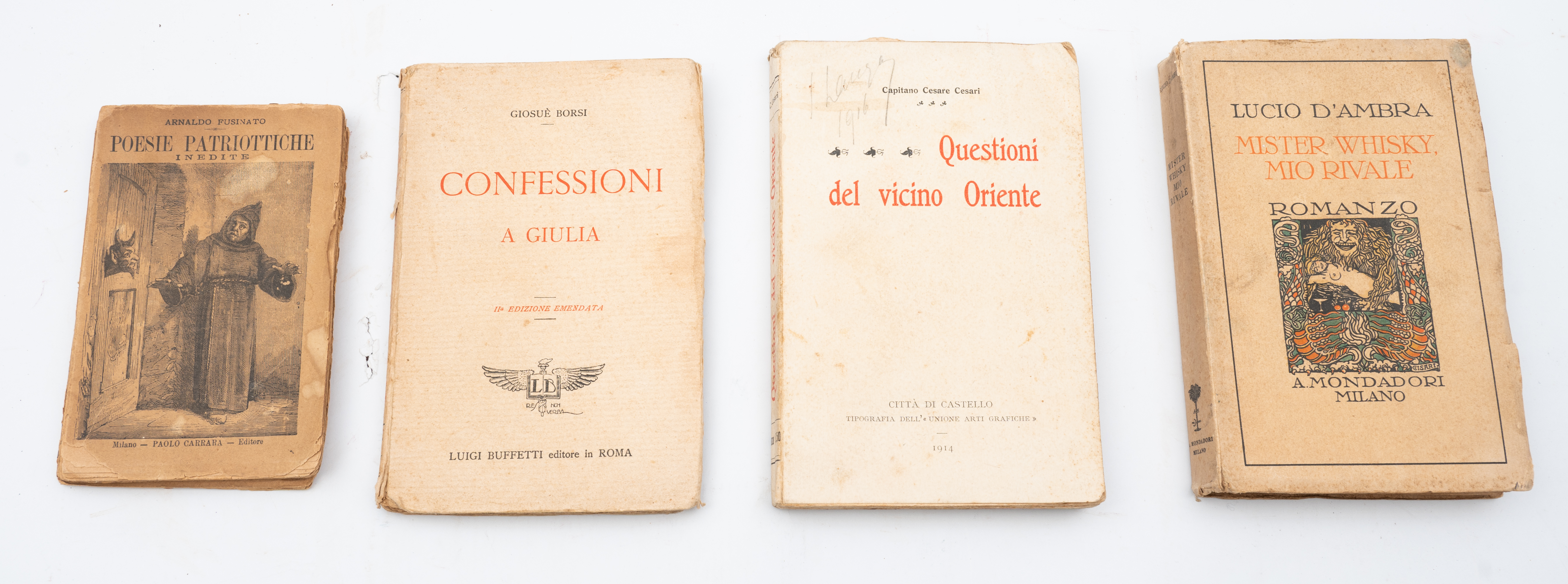 QUATTRO VOLUMI DI VARIA DEI PRIMI DEL ‘900: 1) Arnaldo Fusinato POESIE PATRIOTTICHE, ed. Paolo Carrara, Milano s. d. ( ma 1906). Rara edizione del 1906, con il commento di E. Checchi. In buone condizioni. Pagine con bruniture del tempo. Brossura editoriale figurata con agli non rifilati. Pp. XVI, 176. 2) Giosuè Borsi CONFESSIONI A GIULIA, ed. Luigi Buffetti, Roma 1920. In 8°. Brossura editoriale con tagli irregolari. In buone condizioni. Pp. 176. 3) Capitano Cesare Cesari QUESTIONI DEL VICINO ORIENTE, ed. Città di Castello, Unione Arti Grafiche 1914. In 8°. Brossura editoriale con tagli non rifilati. In ottime condizioni. Con una mappa più volte ripiegata dell’area dell’odierno Medio Oriente. Pp. 160. 4) Lucio D’Ambra MISTER WHISKY MIO RIVALE, ed. A. Mondadori, Milano 1928. Bella brossura editoriale figurata a colori e marginosa. Tagli marginosi. Volume in ottime condizioni. pp. 308.