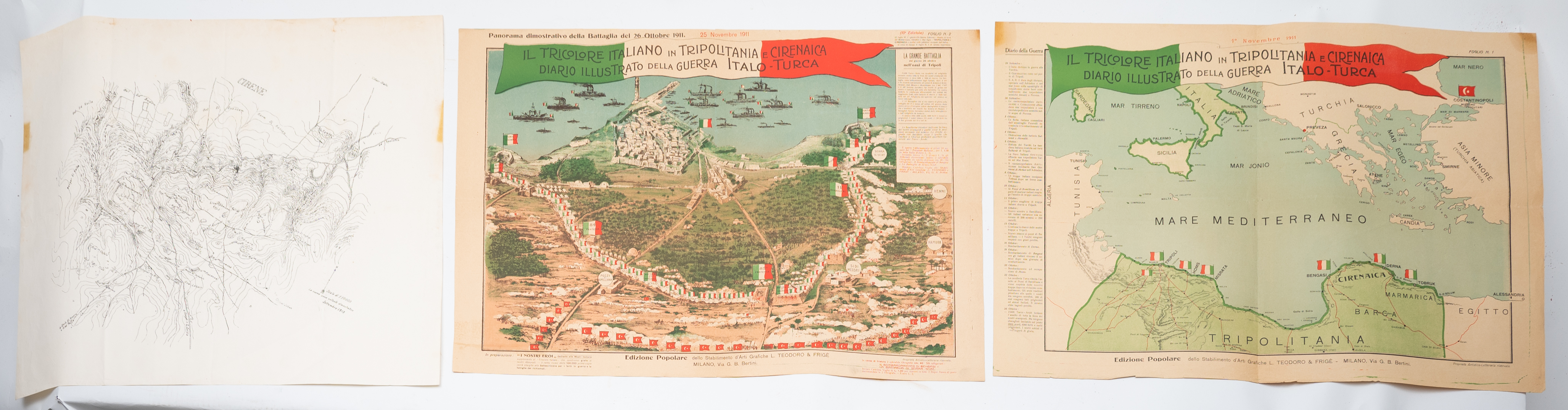 CINQUE CARTE E MAPPE GEOGRAFICHE DEL XIX SECOLO E DEI PRIMI DEL XX SECOLO: 1) MAPPA DELLA ZONA DI CIRENE, datata Settembre 1913. La mappa, in b/n ed in ottime condizioni, misura cm 47 x 56. 2) Due mappe, IL TRICOLORE ITALIANO IN TRIPOLITANIA E CIRENAICA, DIARIO ILLUSTRATO DELLA GUERRA ITALO-TURCA, foglio 1 e foglio 2, della Serie Edizione Popolare, edite per i tipi di Arti Grafiche L. Teodoro e Frigè, Milano 1911. Le due mappe, a colori, misurano cm 64,4 x 44,4. Le mappe sono in più che discrete condizioni. 3) CARTE ROUTIERE DE L'ITALIE E D'UNE PARTIE DES ETATS LIMITROPHES DRESSÈE PAR TH. DUVOTENAY GÉOGRAPHE AU DÉPOT DE LA GUERRE ELÉVE DE M. P. LAPIE, (s. d. ma 1836 circa), in due carte. Le carte, entrambe in ottime condizioni, misurano cm 52 x 35.