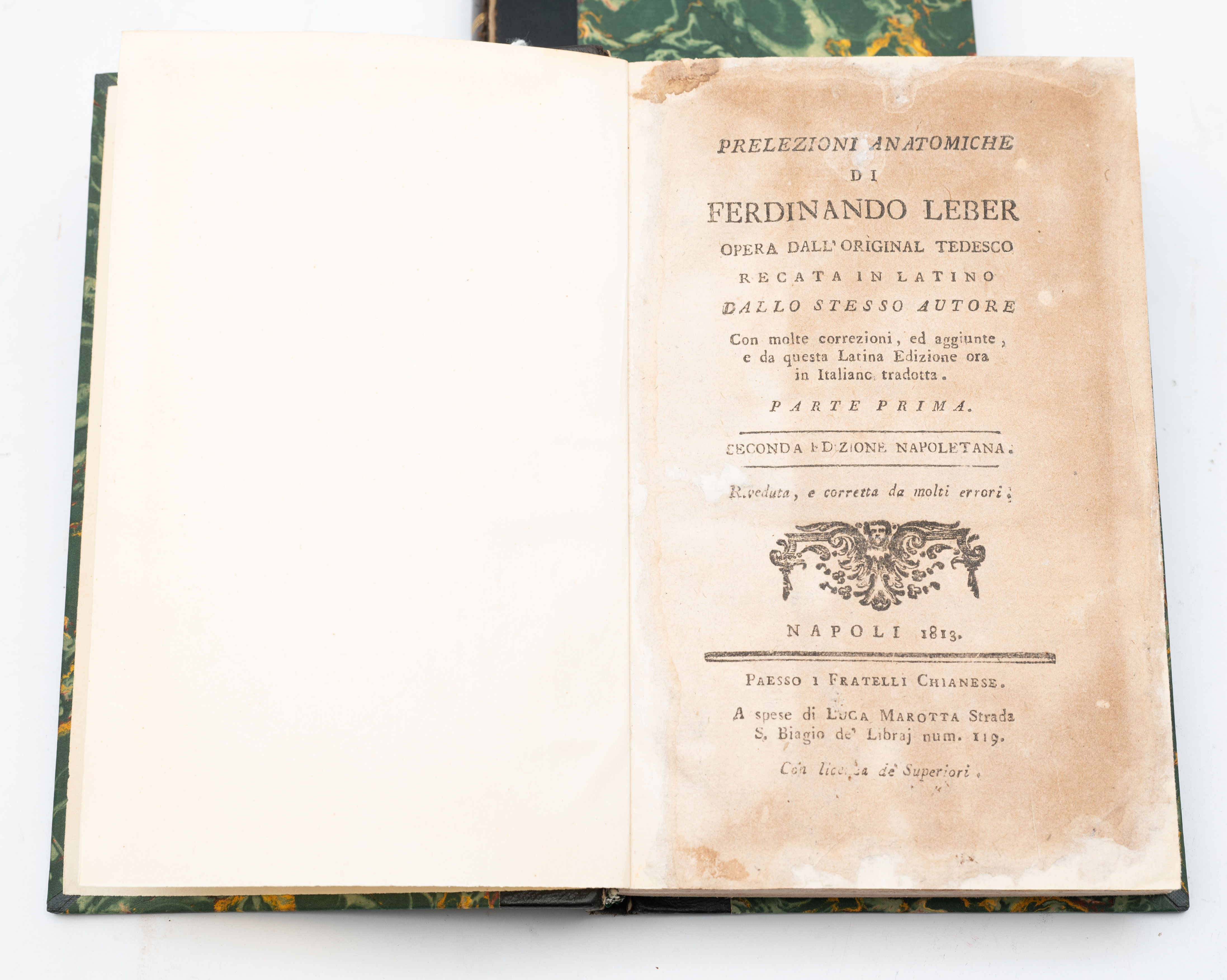 DUE OTTOCENTINE: Ferdinando Leber PRELEZIONI ANATOMICHE, ed. Napoli 1813 presso i Fratelli Chianese. 2 volumi in 8° piccolo. Elegante legatura successiva degli anni ‘50 del ‘900 in mezza pelle con piatti cartonati e titoli e fregi impressi in oro al dorso. Pagine pulite e ben tenute. Con due tavole più volte ripiegate. Pp. 246; 237.