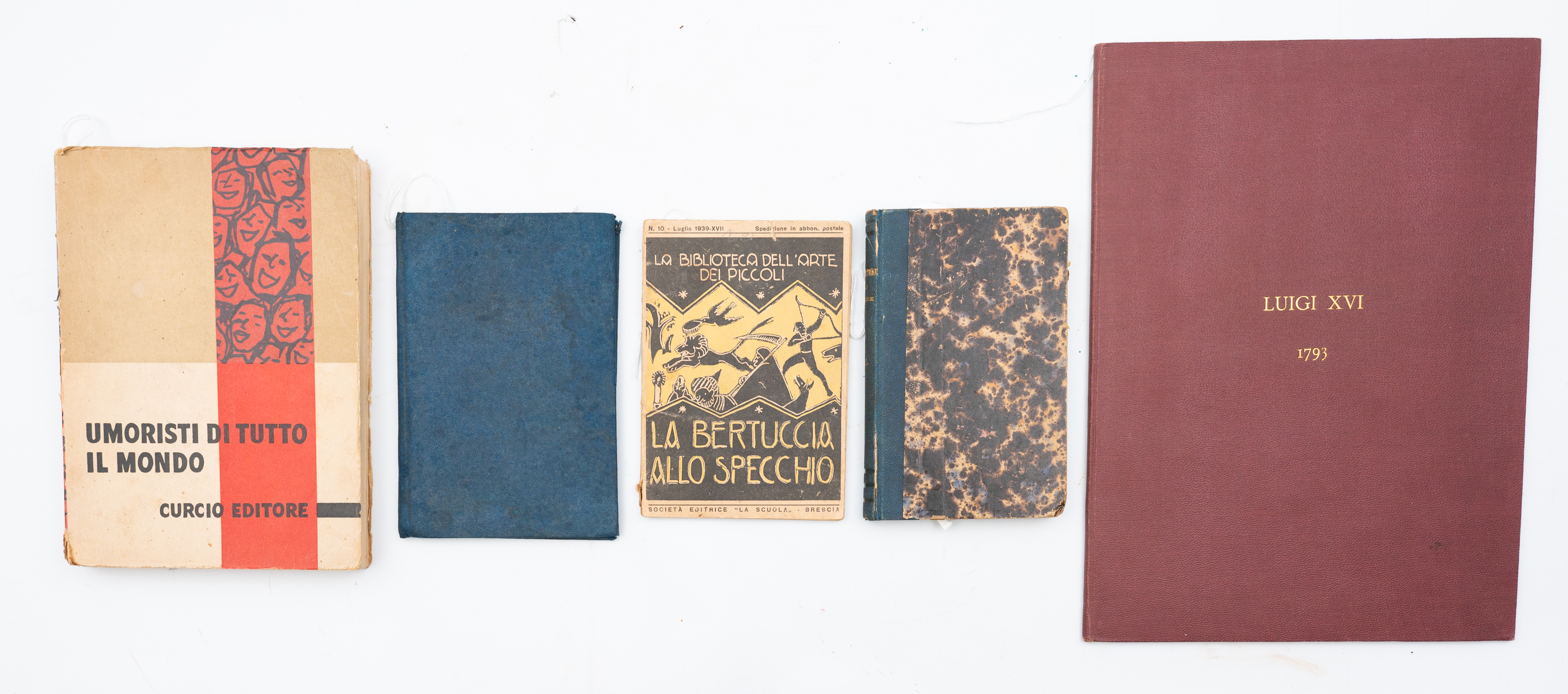 CINQUE VOLUMI DI VARIA DEL XIX E XX SECOLO: 1) Davide Livingstone LO ZAMBESE ED I SUOI AFFLUENTI. SECONDO VIAGGIO (1858 – 1864), ed. Milano, Serafino Muggiani 1878. Edizione illustrata. 2 volumi in un unico tomo in 16°. Legatura coeva in mezza percallina con piatti marmorizzati e titoli e filetti impressi in oro al dorso. Volume in ottime condizioni. Pp. 128; 120, (8). 2) Vittorio Alfieri SAUL – FILIPPO, TRAGEDIE DI VITTORIO ALFIERI, ed. Milano, Sonzogno 1882. In 16°. Legatura coeva in stoffa rigida con titoli impressi in oro al dorso. In più che discrete condizioni. Pp. 98, (2). 3) La Biblioteca dell’Arte dei Piccoli LA BERTUCCIA ALLO SPECCHIO, ed. Brescia, La Scuola 1939. Favole di Fedro, di Lessing e di Krilow riprese da Francesco Bettini. In 16°. Brossura editoriale. Volume in eccellenti condizioni. pp. 63. 4) LUIGI XVI 1793, ed. Edoardo Sonzogno s. d. ( ma 1906 circa). In 4°. Legatura coeva in piena percallina rigida con titolo impresso in oro al piatto. Volume in eccellenti condizioni. stampato su due colonne. Pp. 31. 5) UMORISTI DI TUTTO IL MONDO, ed. Armando Curcio, Roma 1954. Nelle traduzioni di Giovanni Artieri, Maria Martone, Maria Dibilio, Mario Moresi ed altri. In 8°. Volume in brossura editoriale figurata a colori. In ottime condizioni. pp. 359, (6).