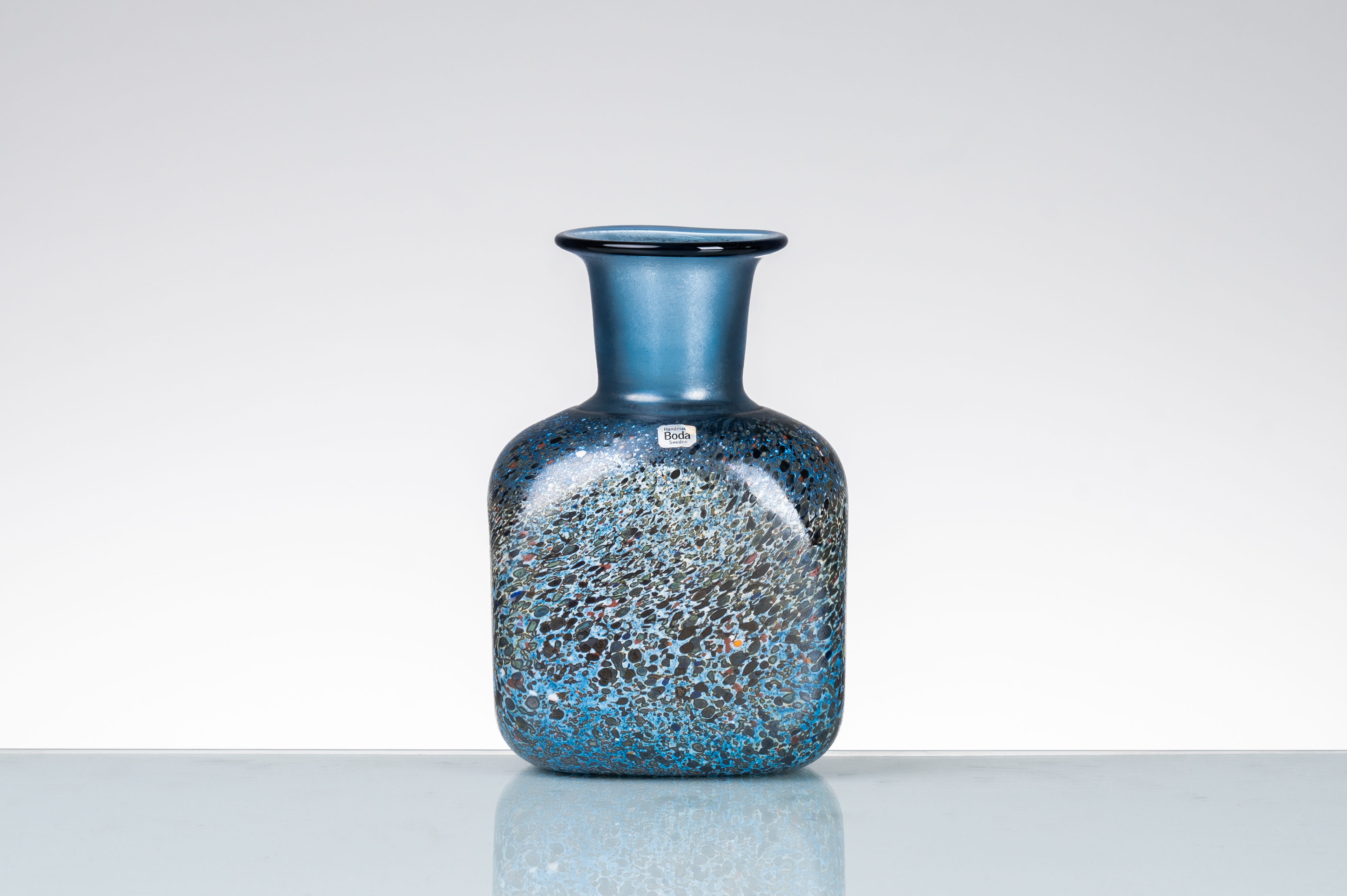 Vaso in vetro della serie Bagdad modello “47640”, vetro azzurrino decorato a punti policromi, corpo cubico con collo cilindrico e bocca circolare piana. Firma a graffio ed etichetta di produzione.