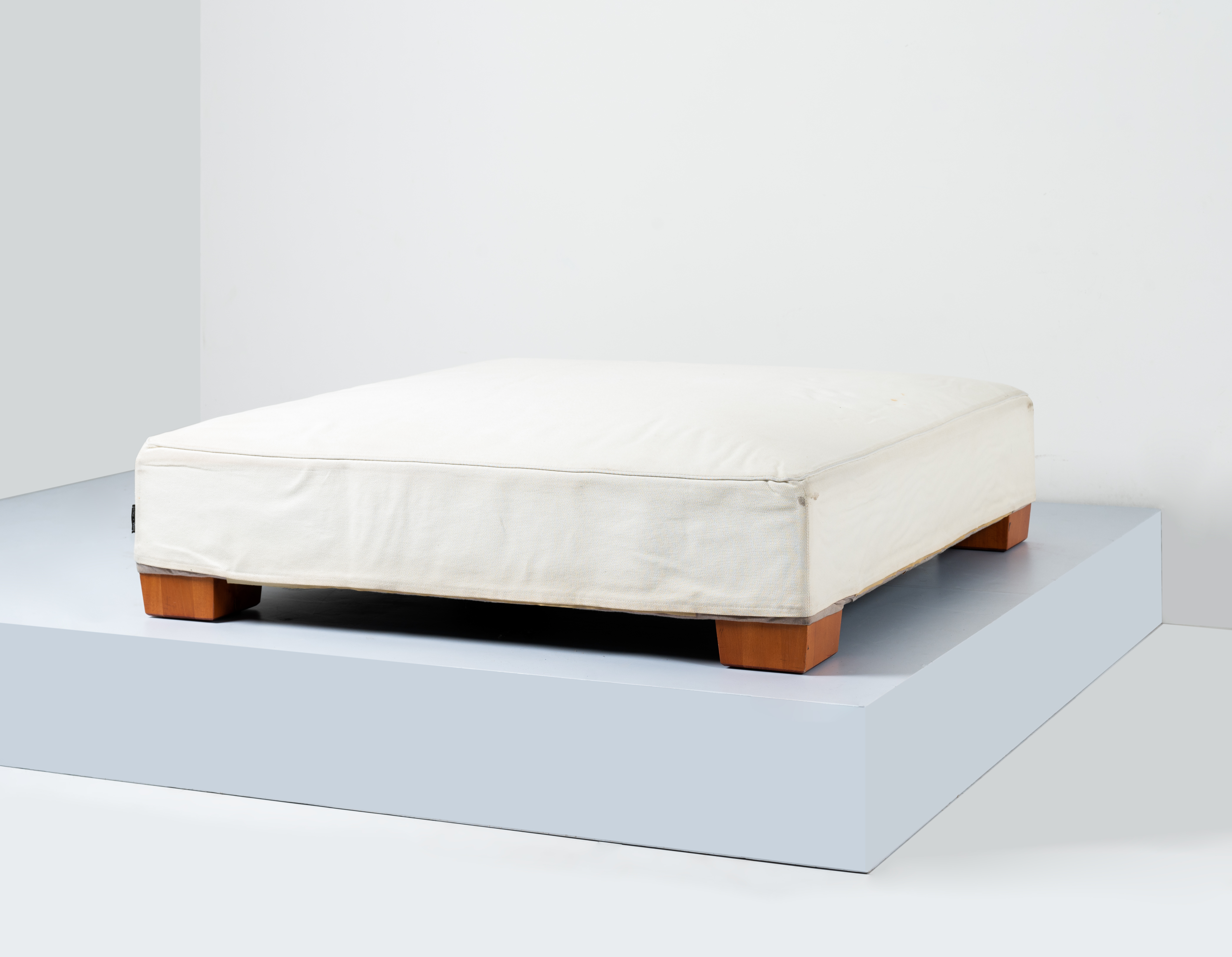 Pouff modello “Groundpiece”, struttura in legno con imbottitura e rivestimento sfoderabile in tessuto bianco, piedi in ciliegio. Segni di uso e lievi macchie. Etichetta di produzione.
