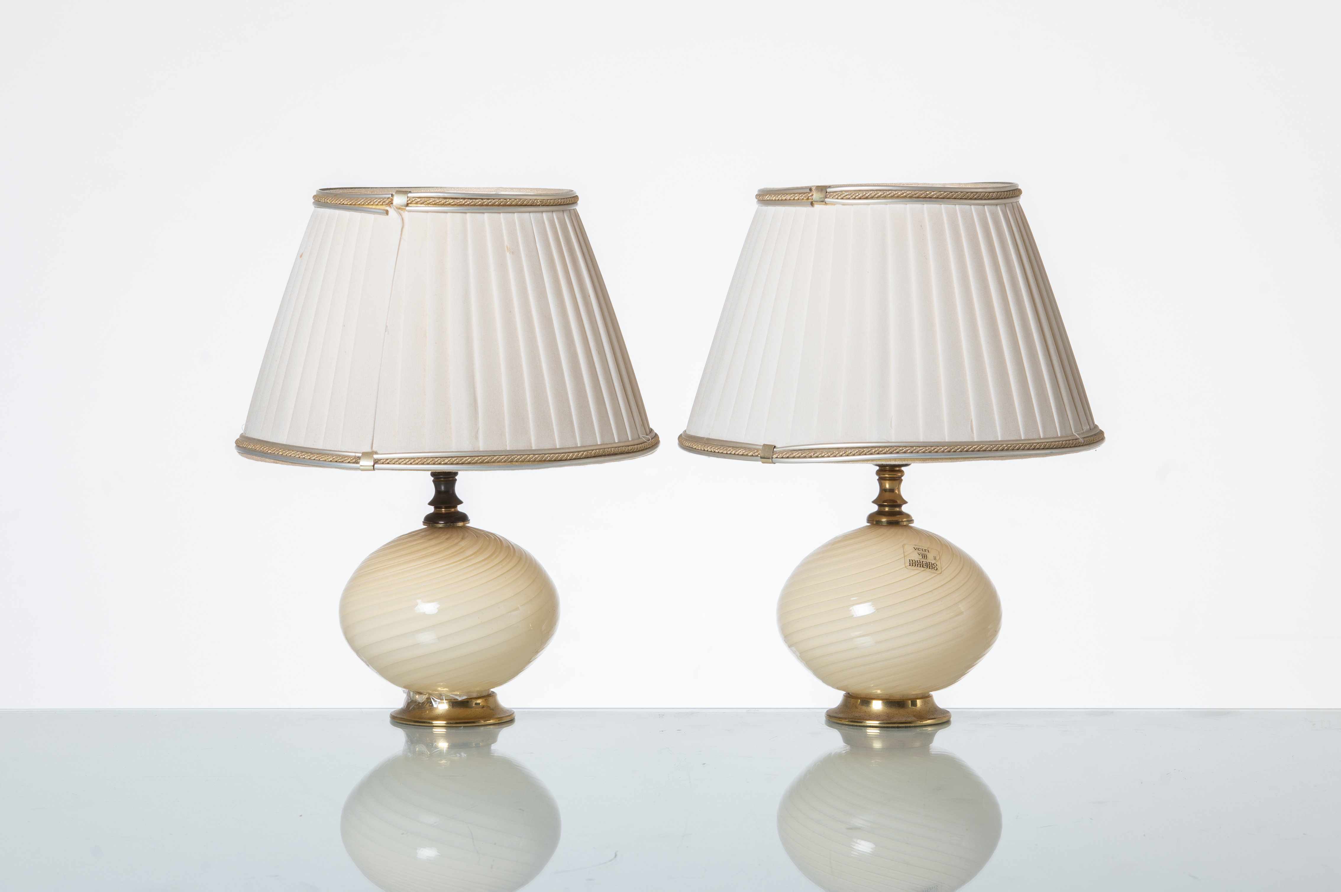 Coppia di lampade da tavolo ad una luce, struttura in metallo dorato, corpo globulare in vetro avorio decorato con rigature a spirale, diffusore in tessuto avorio. Etichetta consorzio vetri Murano.