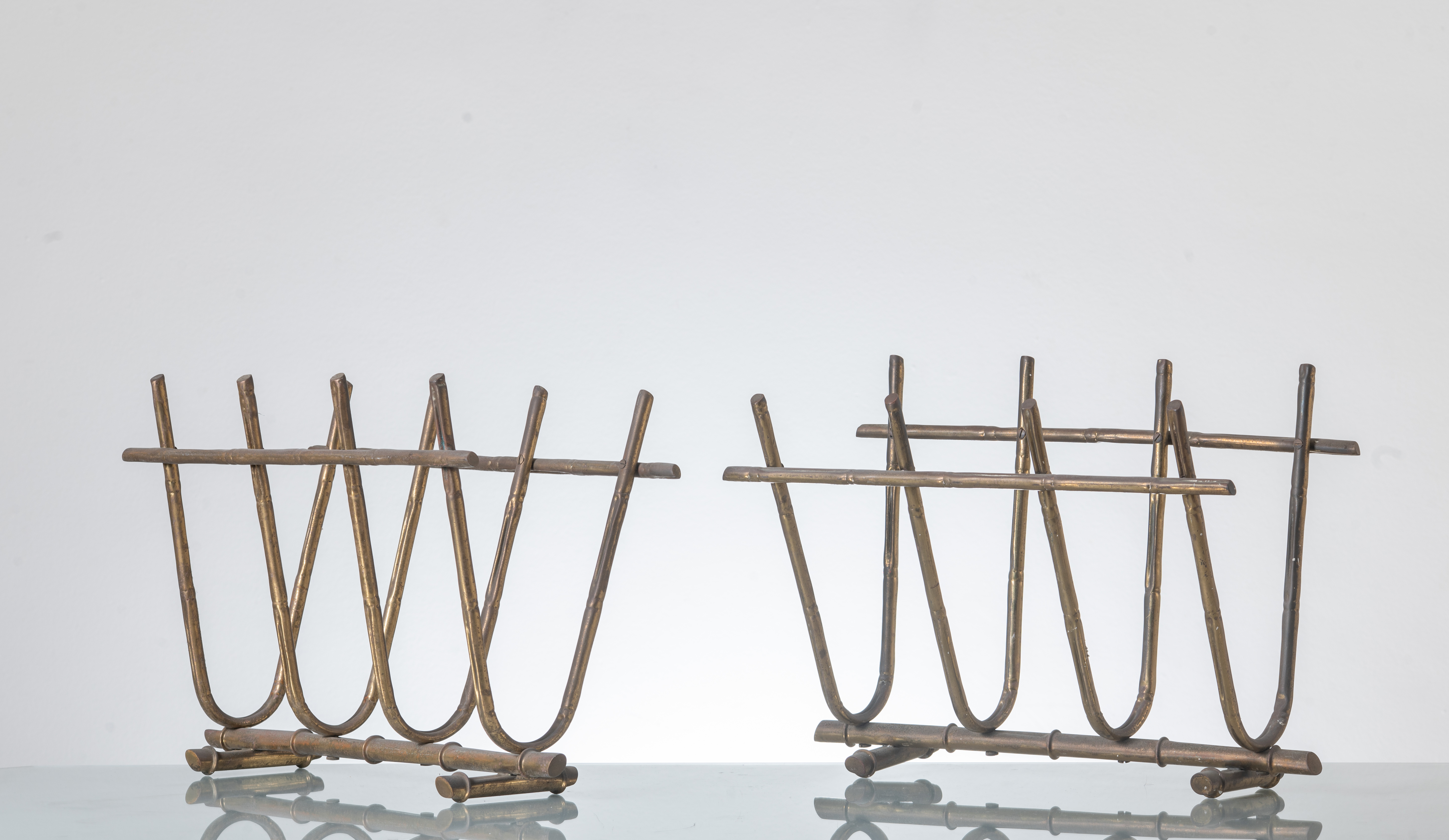 Coppia di portariviste in metallo dorato a canna di bamboo, elementi curvati a coda di rondine. Segni di uso e ossidazioni.