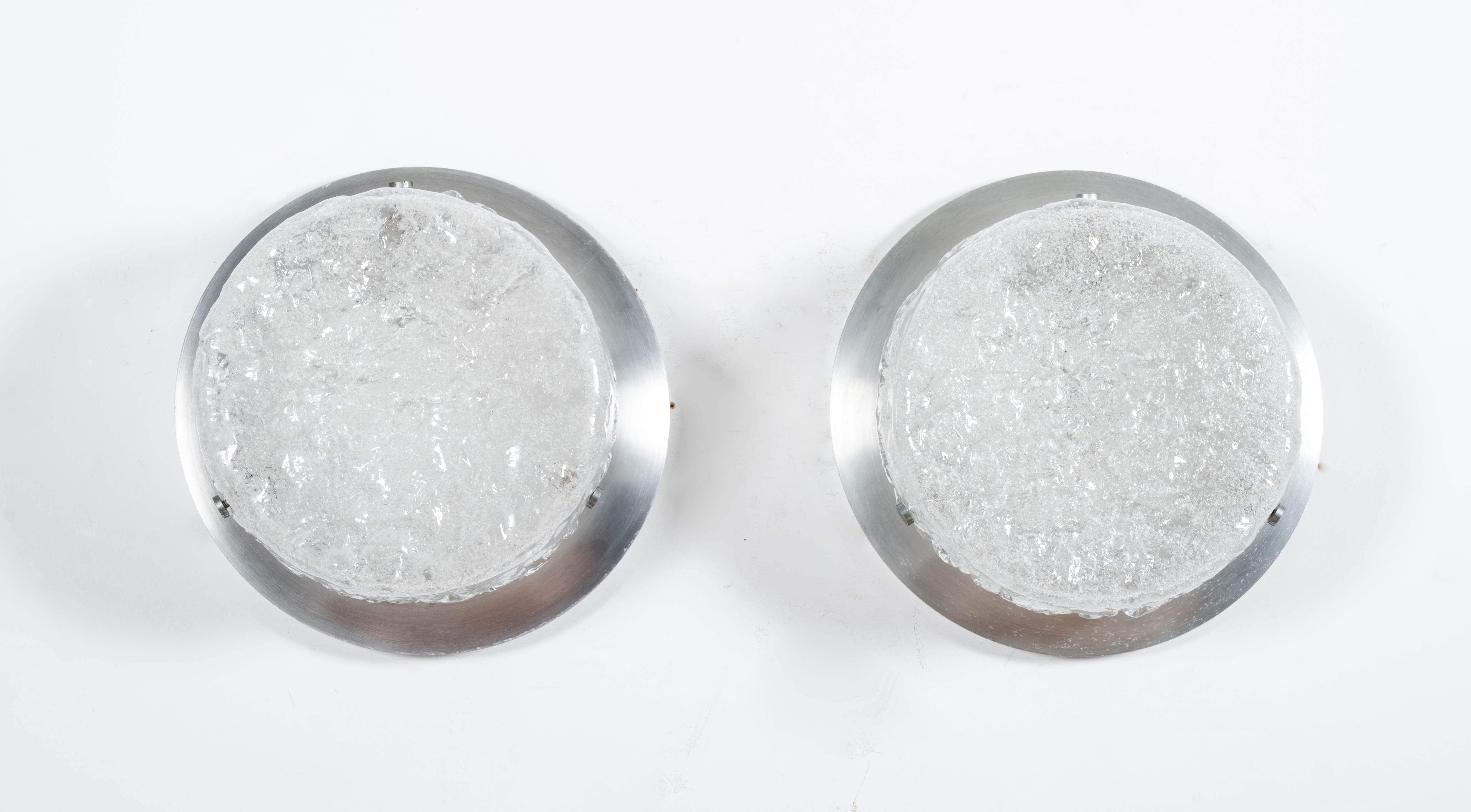 Coppia di lampade da soffitto o parete ad una luce, struttura in metallo cromato con diffusore circolare in vetro incolore ghiacciato. Segni del tempo