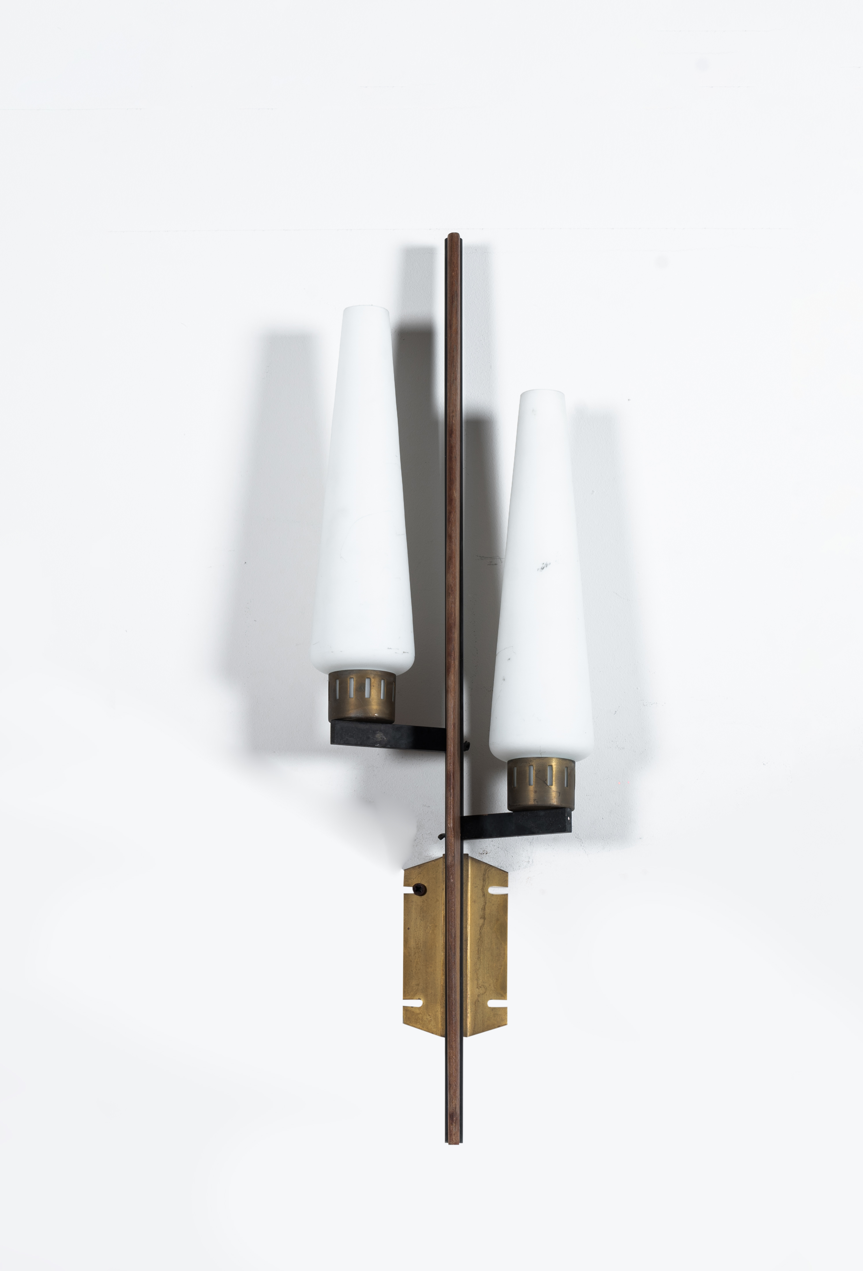 Lampada da parete a due luci, struttura in ferro verniciato nero, inserto in legno, portalampada in lamina di ottone, diffusore a cono in vetro satinato lattimo.