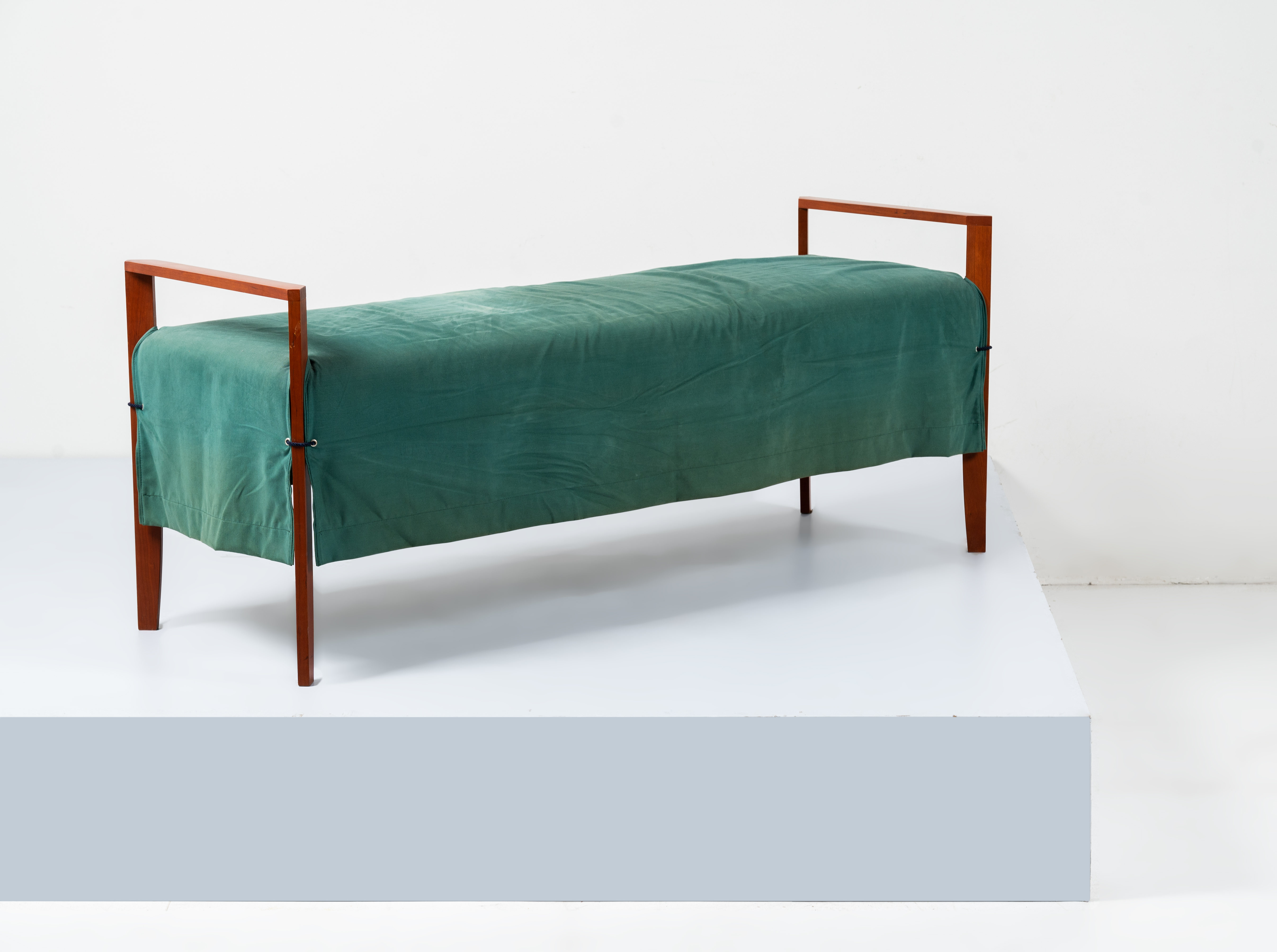 Panca con struttura in legno di ciliegio, seduta con imbottitura, rivestimento sfoderabile in tessuto verde.