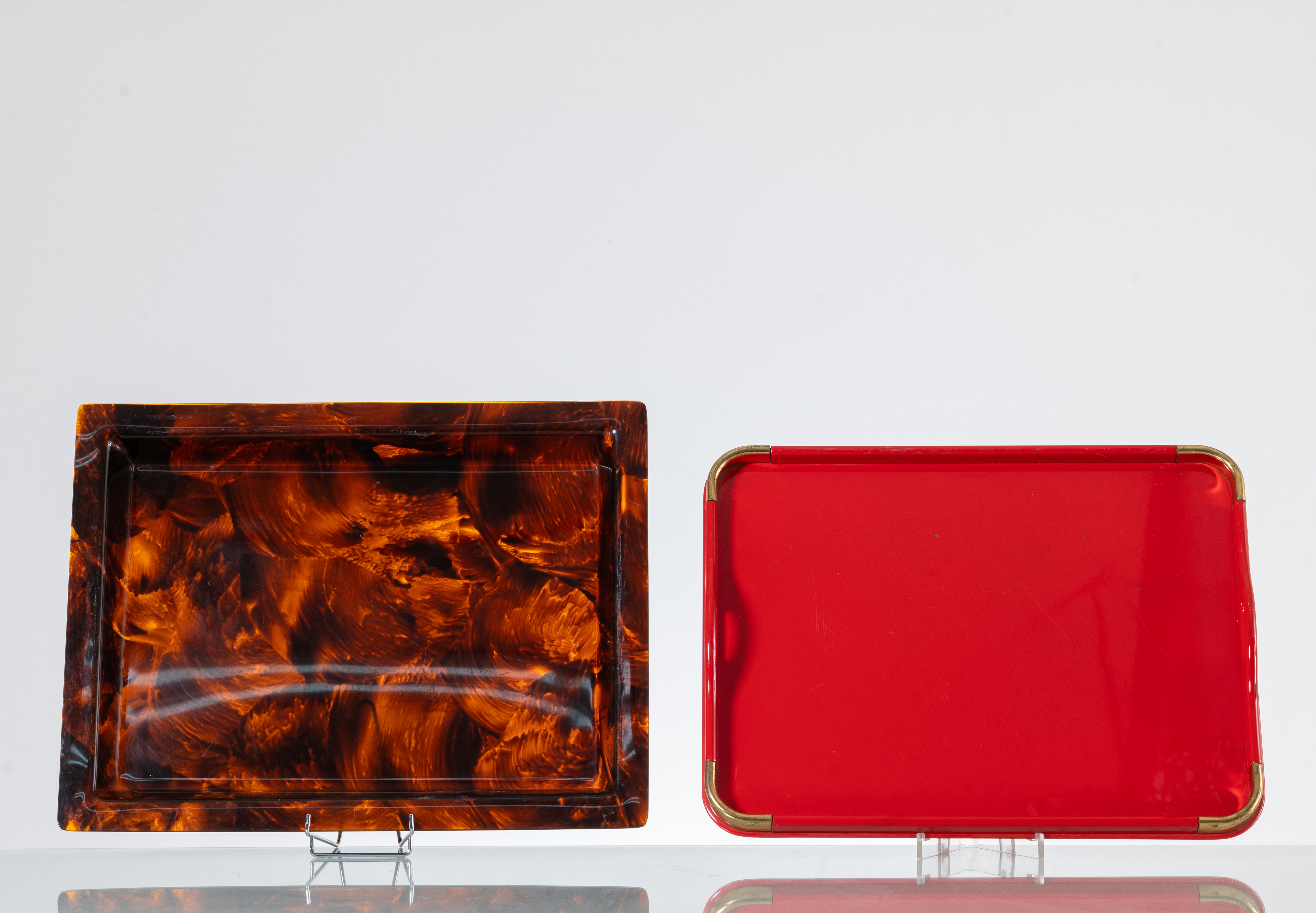 Due vassoi rettangolari, uno in lucite decorato a finta tartaruga, uno laccato in rosso con angoli in ottone. Segni di uso.