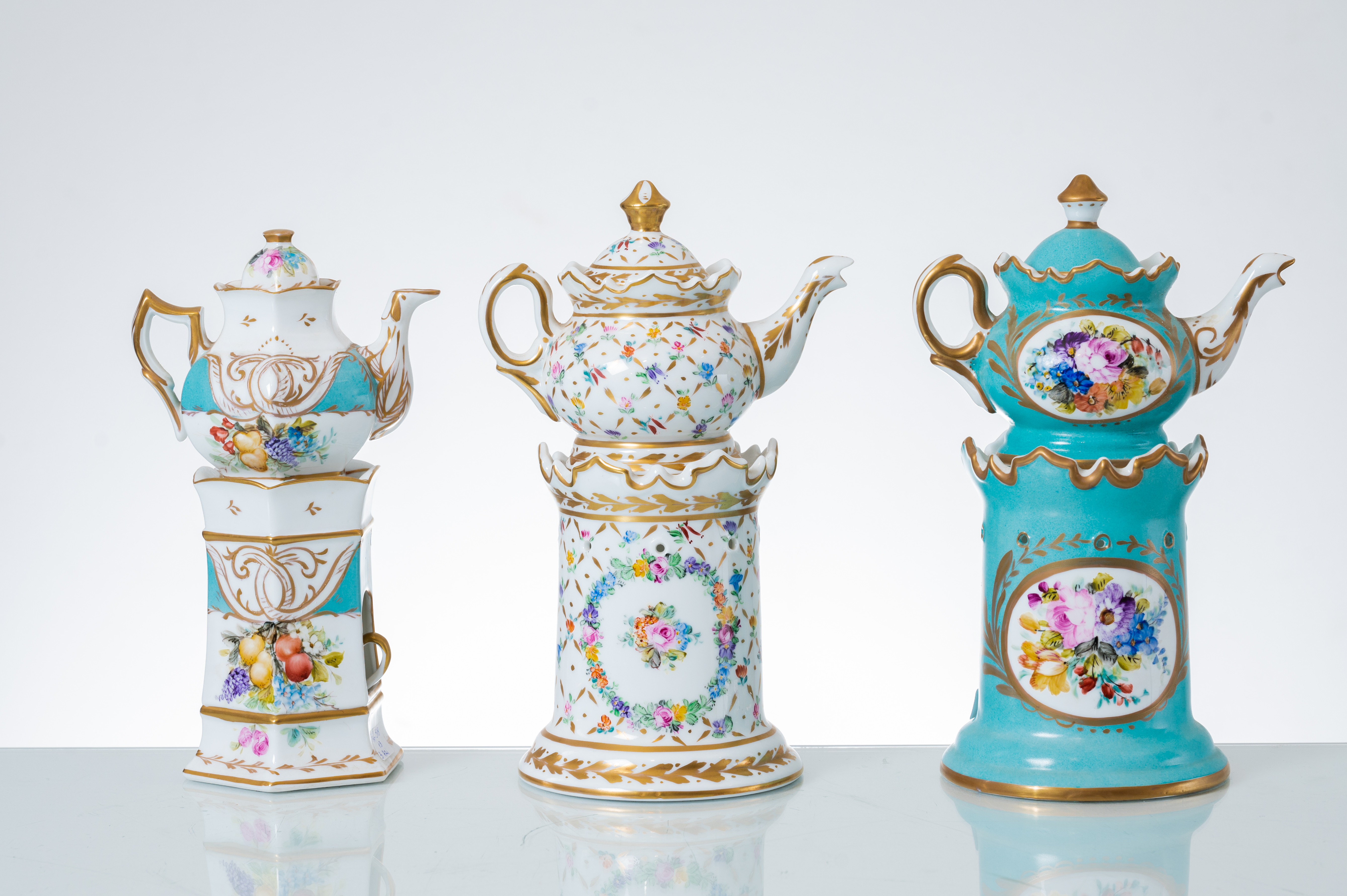 Tre tisaniere Luigi Filippo in porcellana decorata a motivo floreale e fogliaceo con lumeggiature in oro.