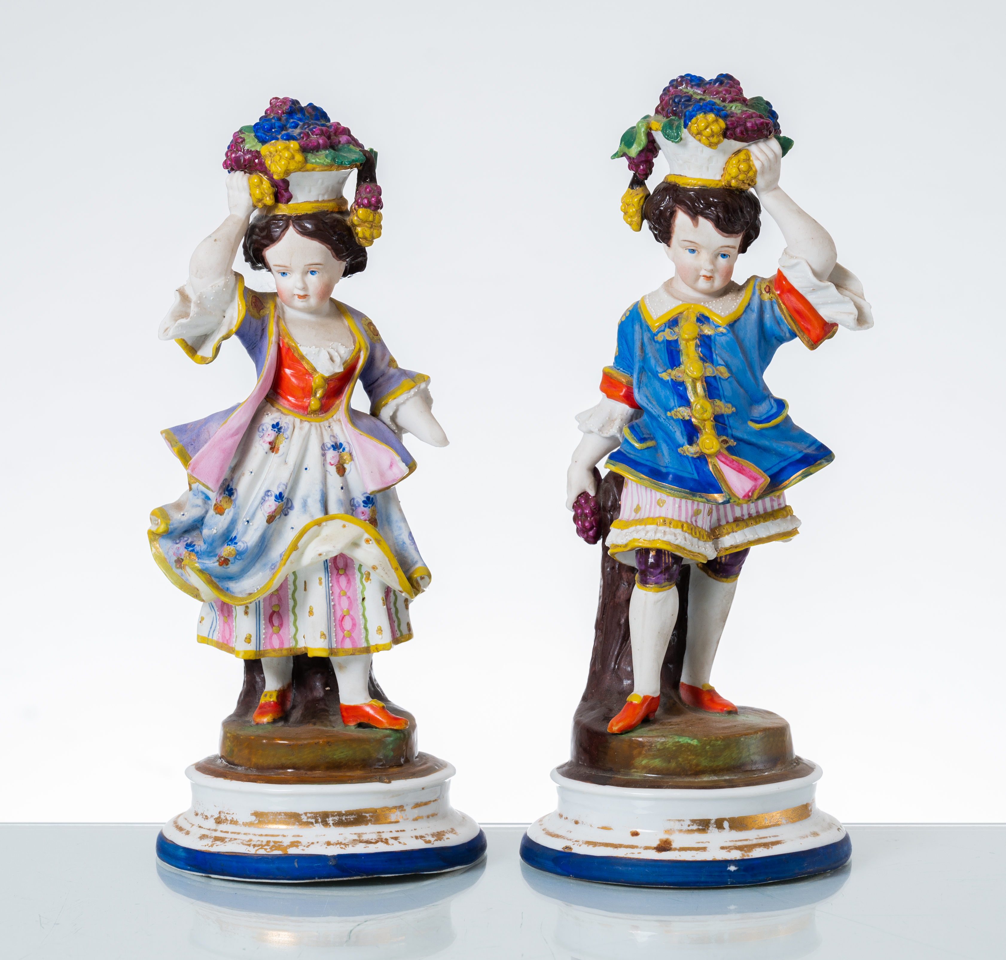 Coppia di sculture in biscuit raffiguranti "Bambini venditori" (mancanze).