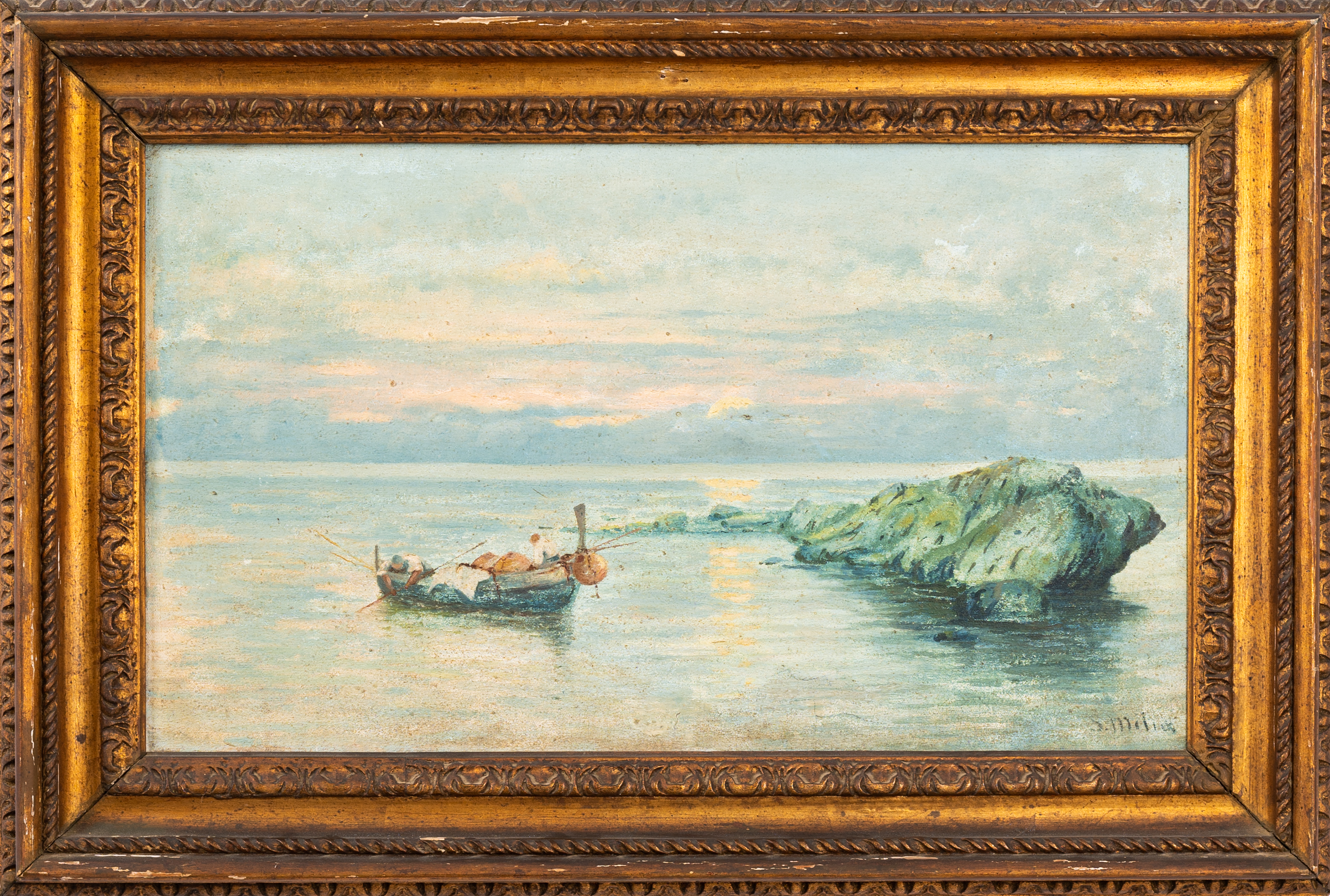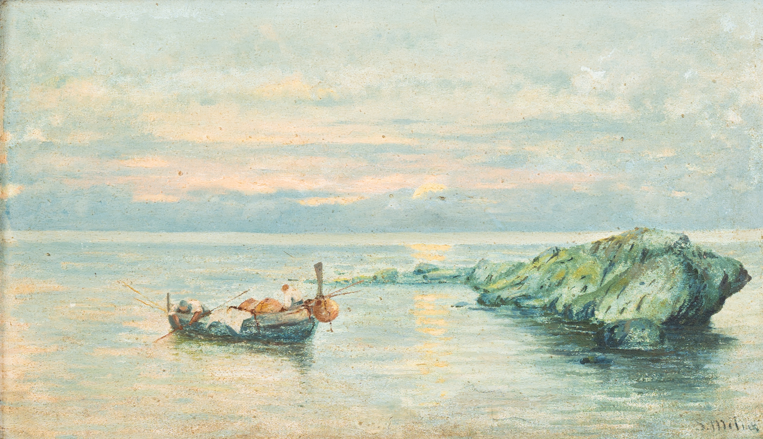 Paesaggio marino con barca e pescatori