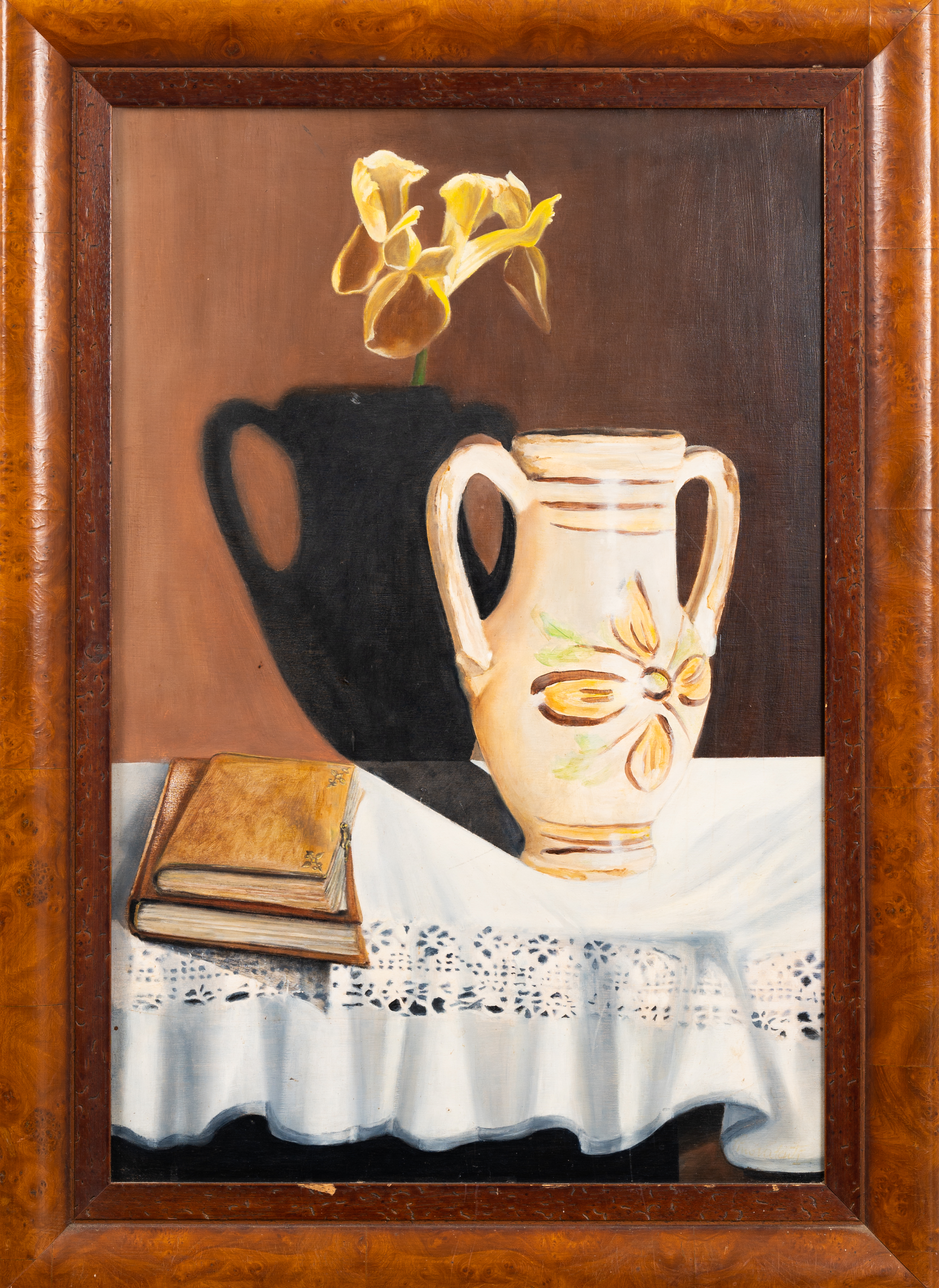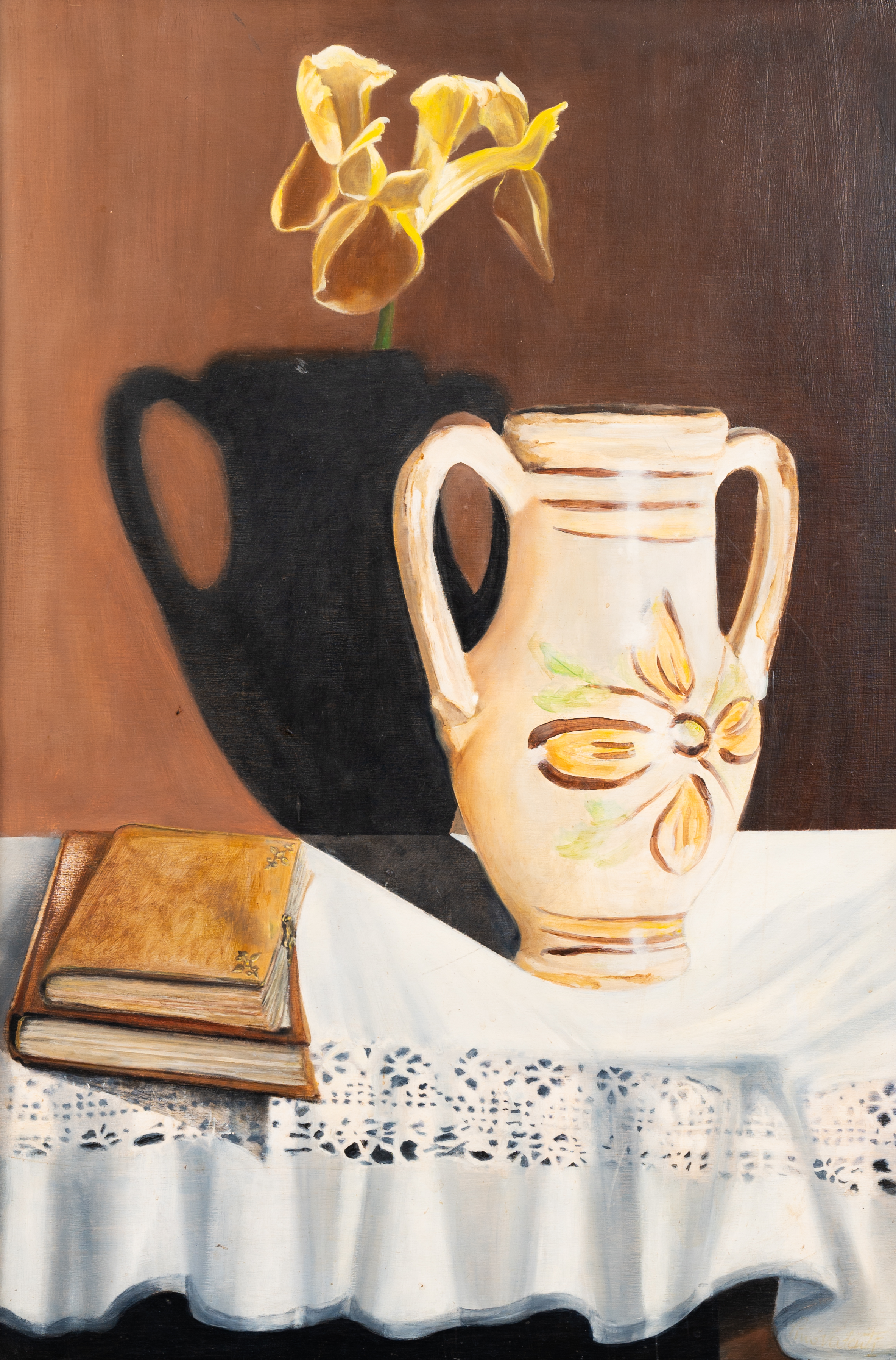 ANONIMO DEL XX SECOLO, Brocca e libri, Olio su tavola