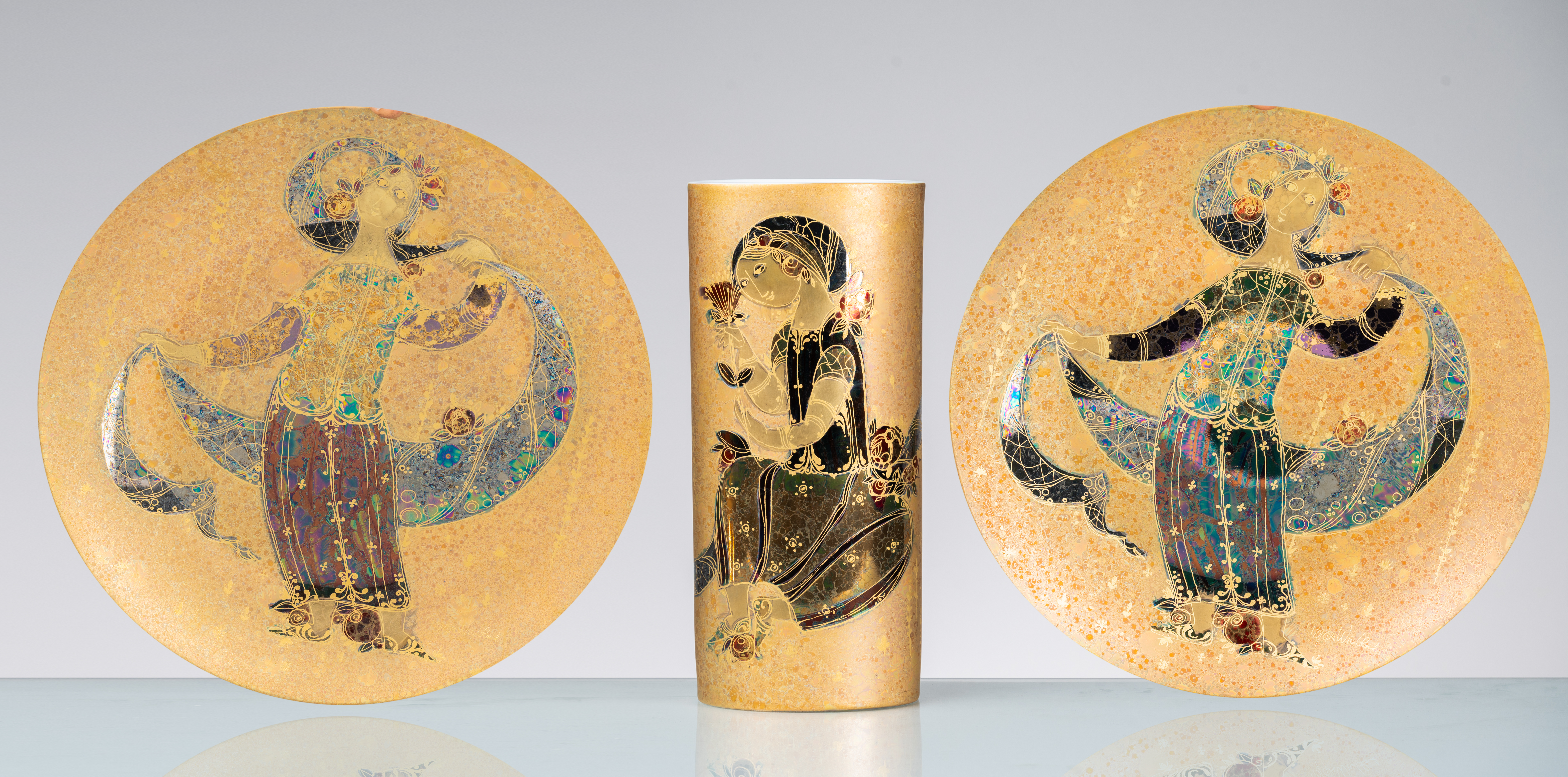 Due piatti ed un vaso della serie “Scheherazade” in porcellana policroma e dorata con decori di figure femminili. Marchio di produzione.
