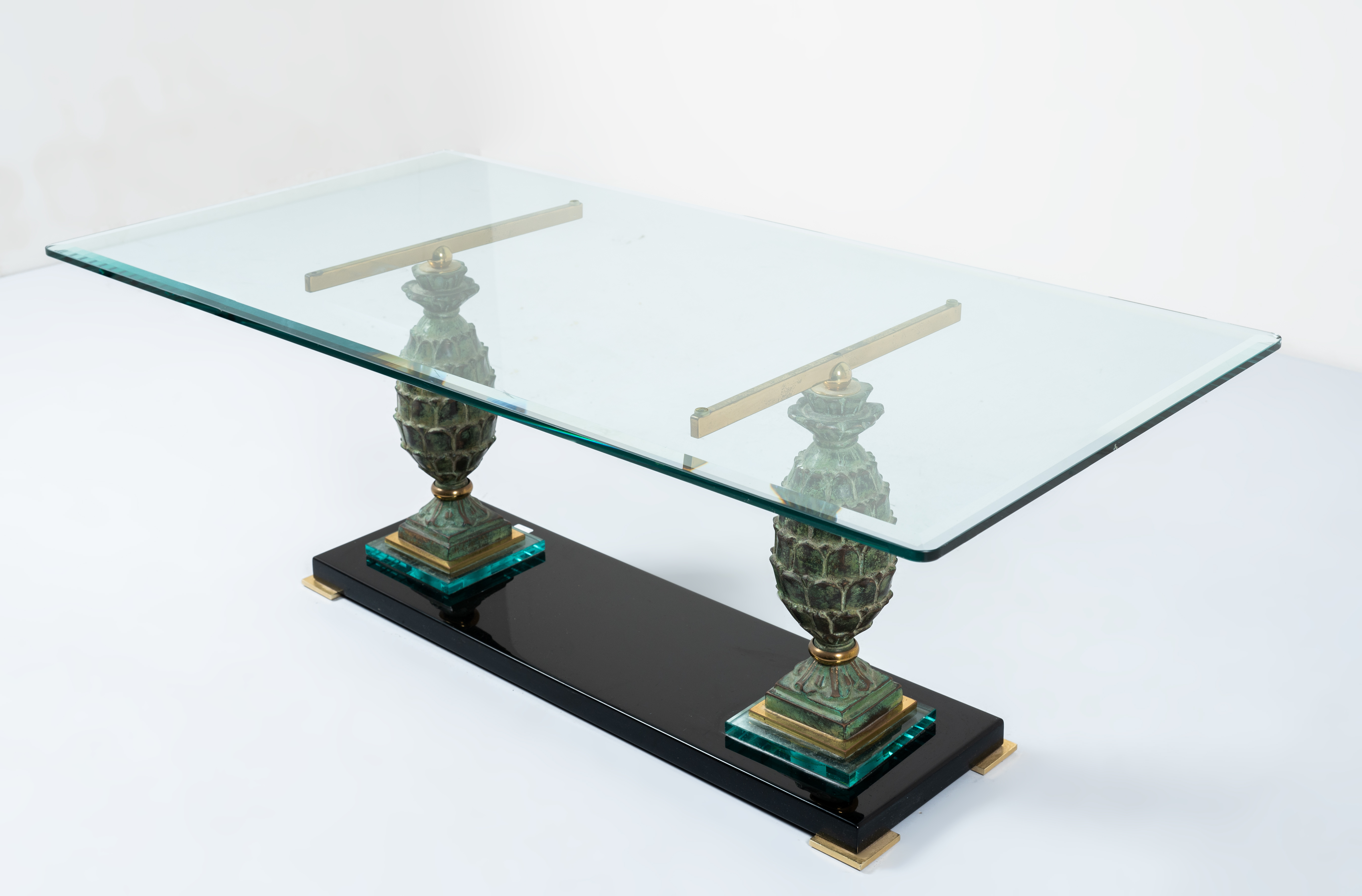 Tavolo da salotto con elementi a pigna decorati a finitura bronzo, base in legno laccato nero, ottone, cristallo, piano rettangolare in cristallo incolore molato e bisellato.