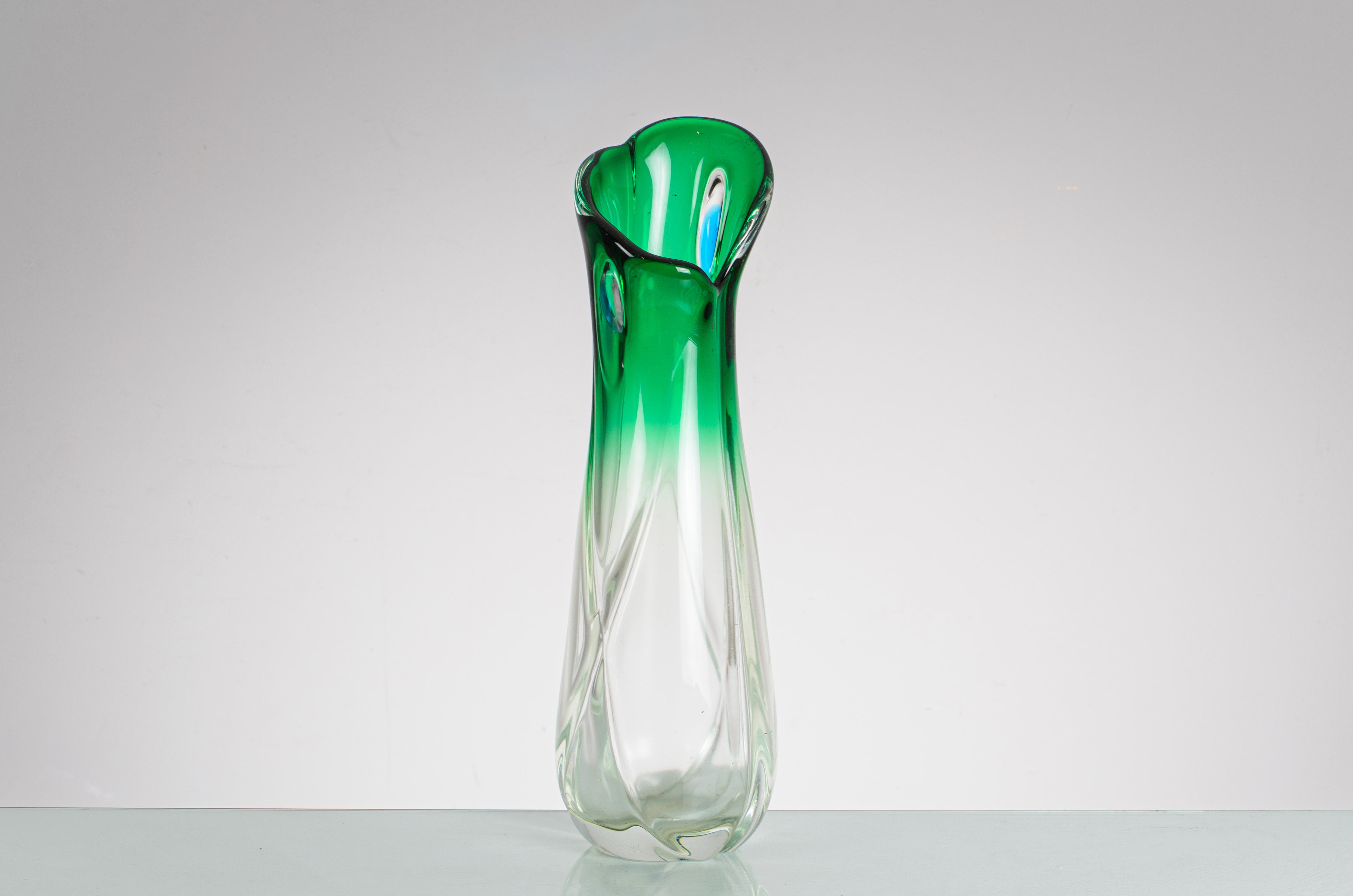 Vaso in vetro a sfumare incolore verde, corpo a goccia con movimento ritorto, bocca asimmetrica diagonale.
