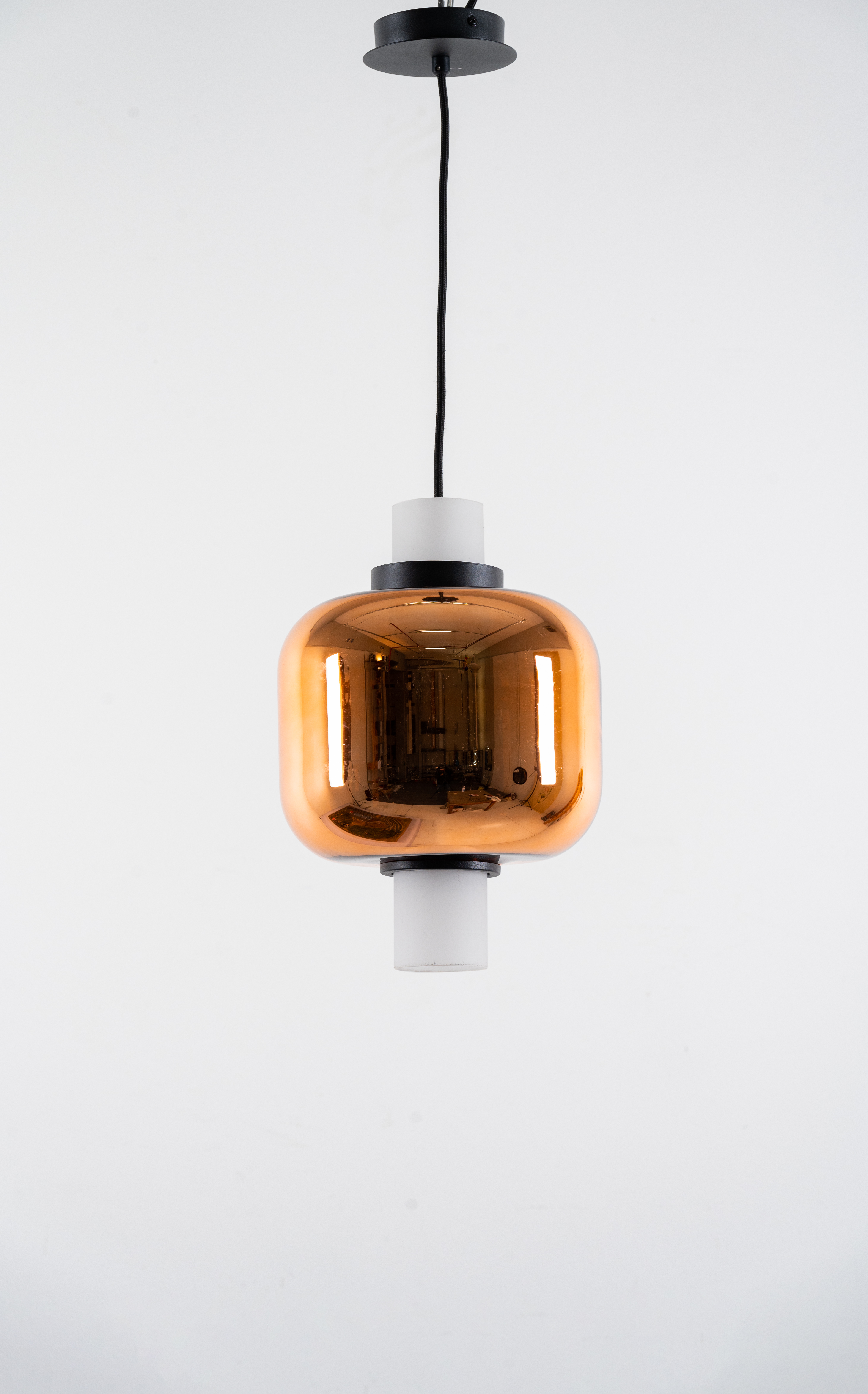 Lampada a sospensione ad una luce, diffusore globulare in vetro specchiato rame, cilindro in vetro opalino, metallo verniciato nero, coppa a soffitto per incasso.