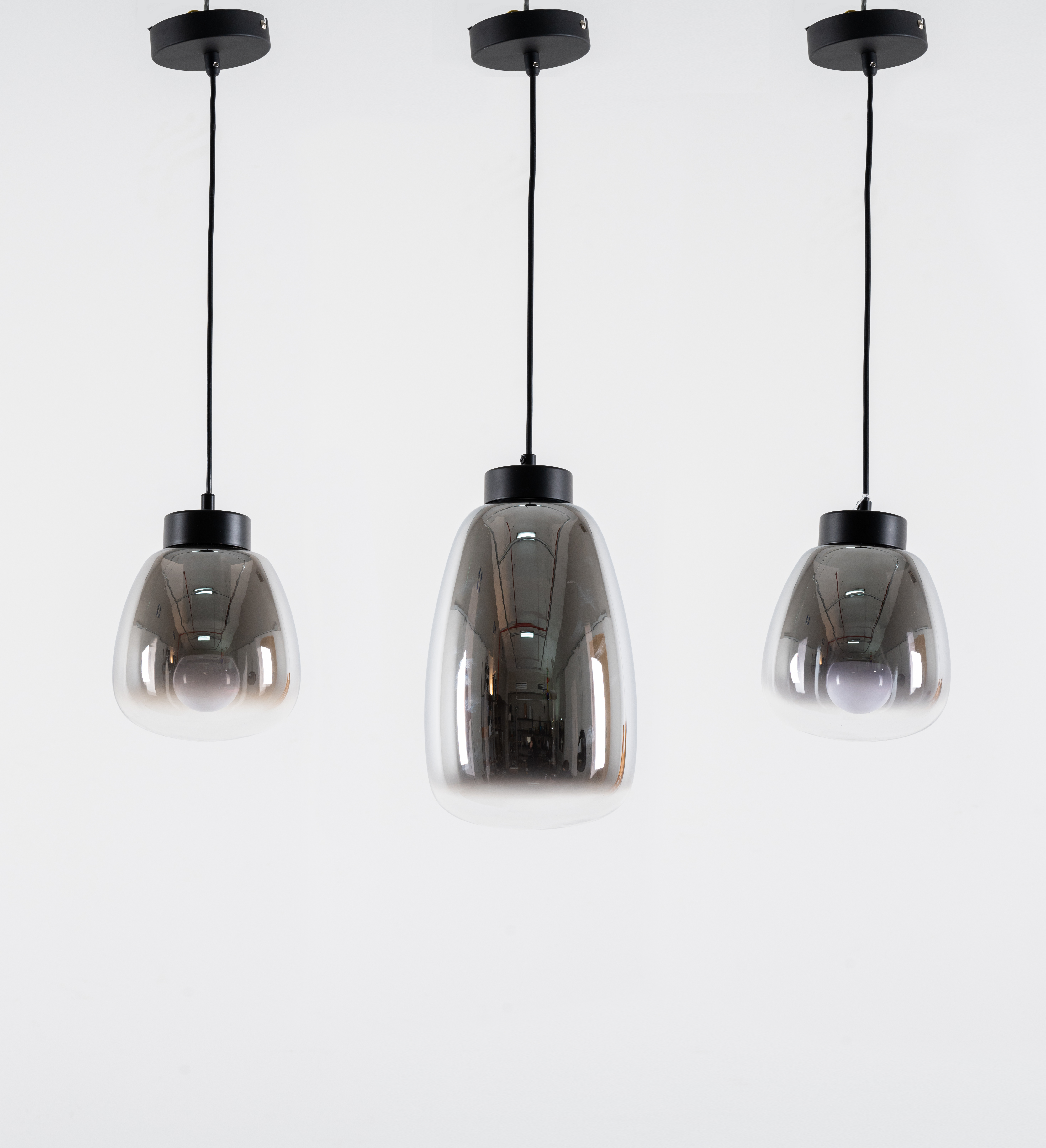 Tre lampade a sospensione ad una luce, una coppia ed una singola, diffusore a goccia in vetro specchiato e parzialmente incolore, struttura in metallo verniciato nero.