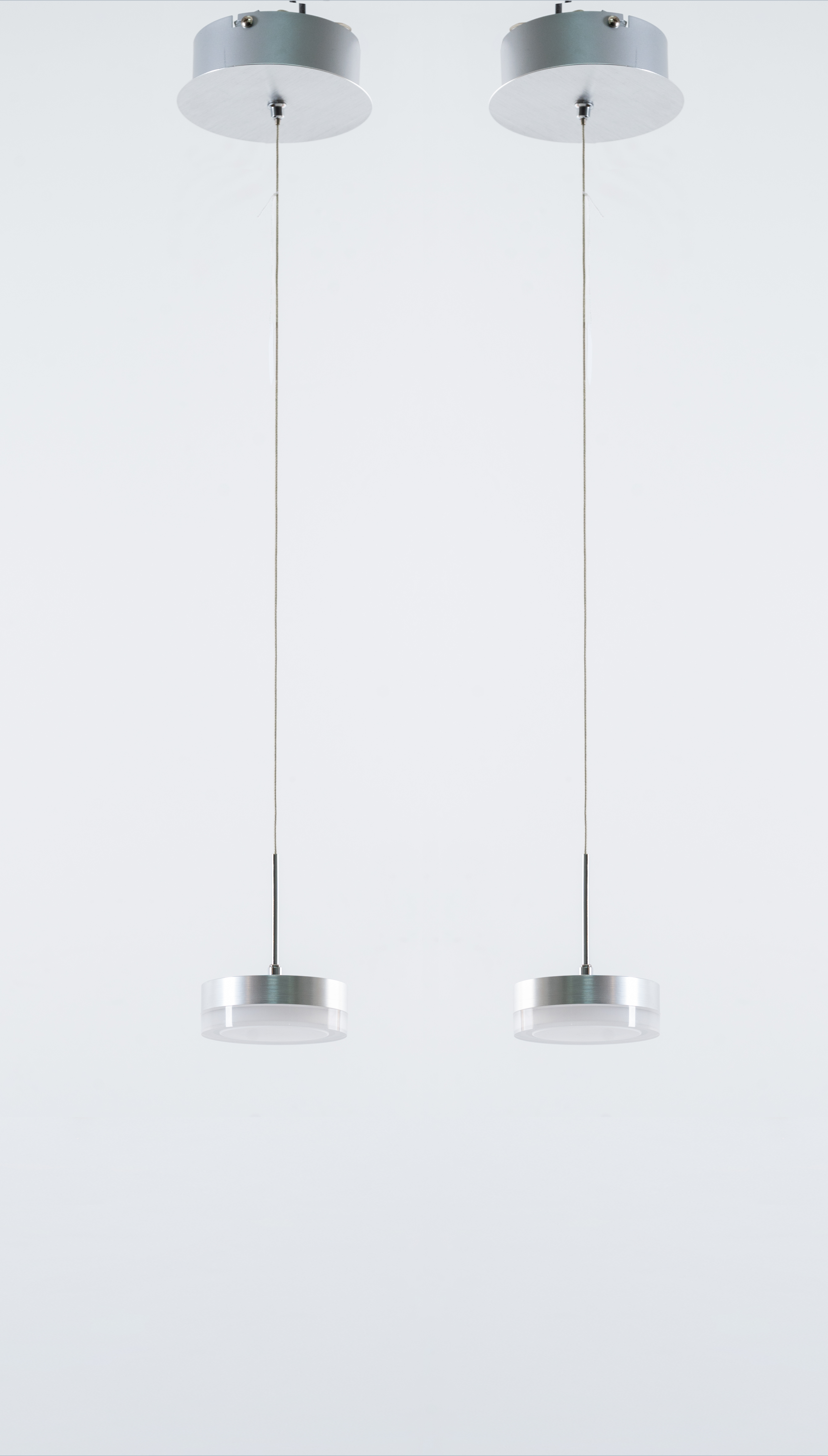 Coppia di lampade a sospensione ad una luce, diffusore circolare con struttura in acciaio satinato e plexiglass lattato, minuterie in metallo cromato, coppa a soffitto per incasso.