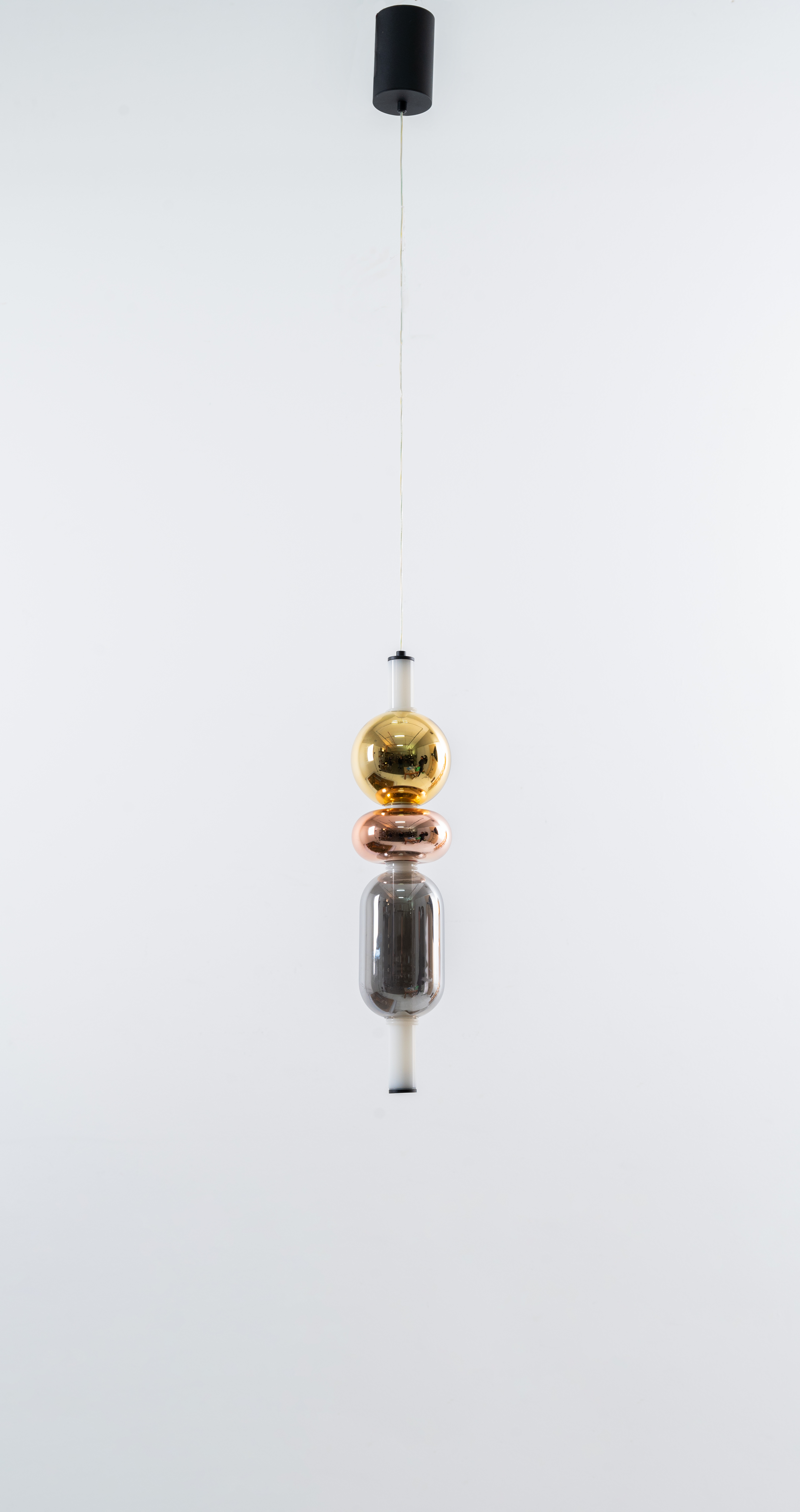 Lampada a sospensione ad una luce, diffusore composto da tre figure geometriche in vetro specchiato oro, rame ed argento, cilindro centrale lattato, base a soffitto in metallo n verniciato nero.