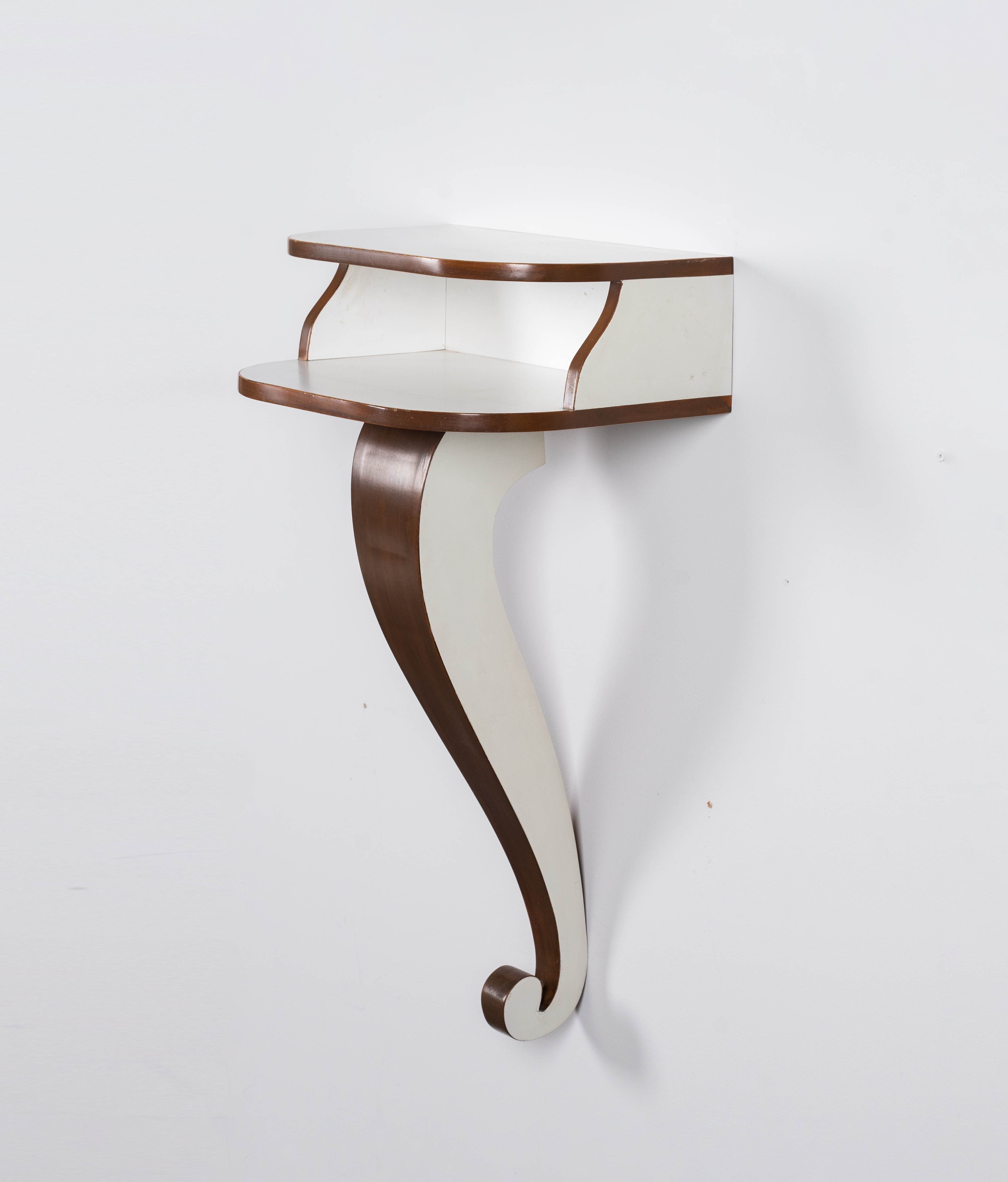 Console in legno bicolore marrone e bianco, due piani sovrapposti con sostegno sagomato.