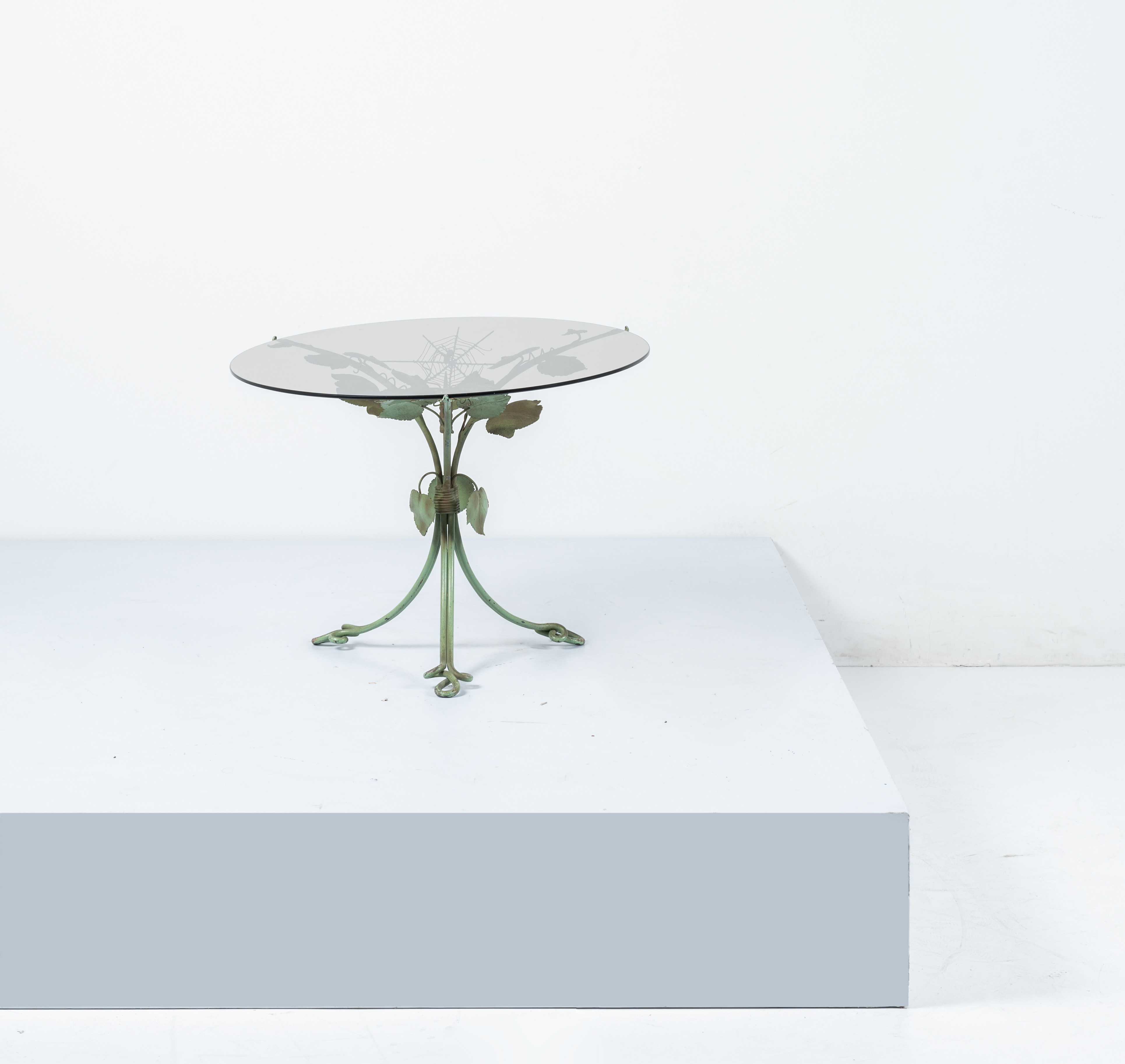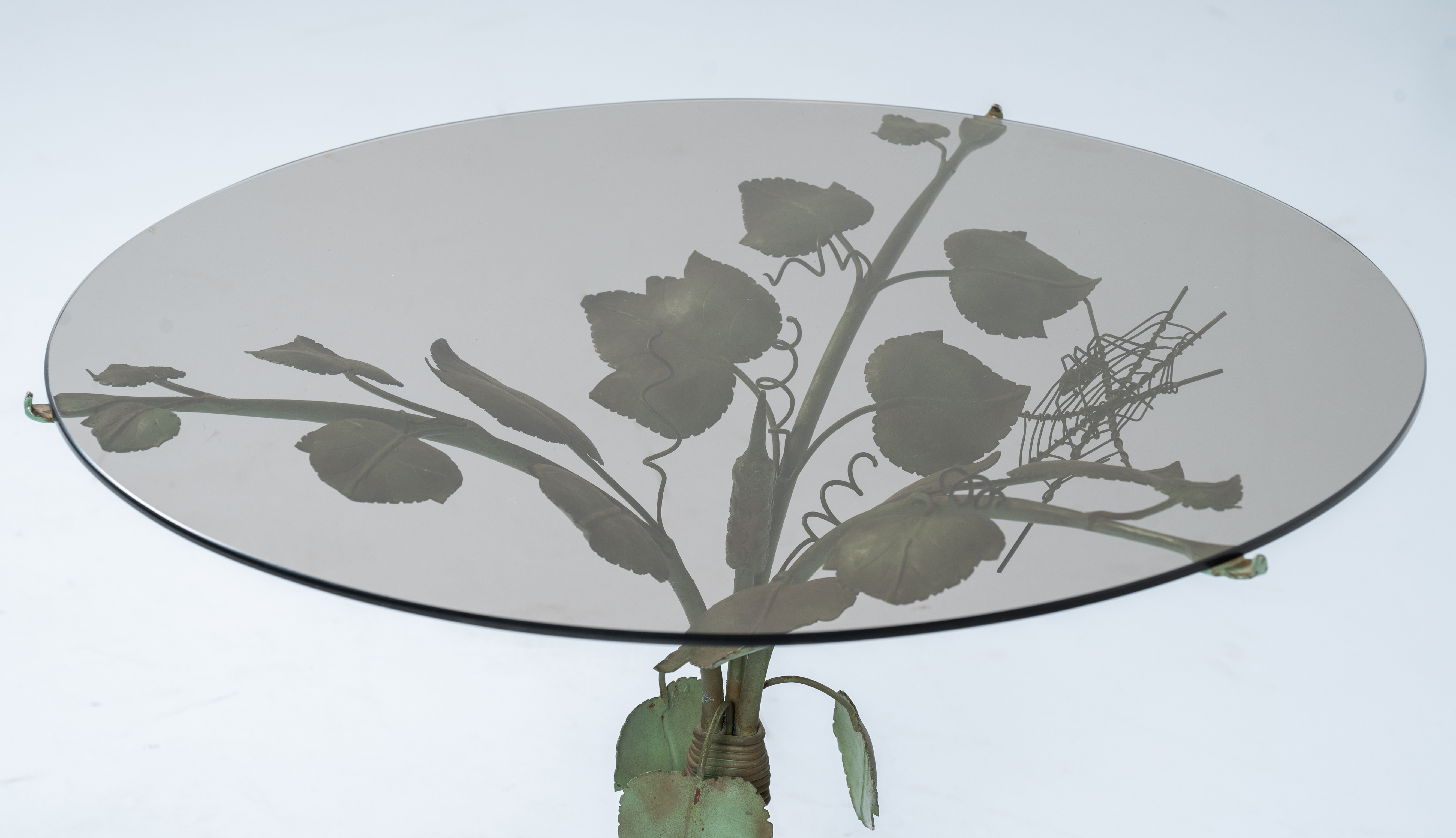 Tavolo occasionale con struttura in ferro battuto, forgiato e laccato verde, struttura a tralci vegetali con ragnatela e ragno, piano circolare in vetro trasparente.