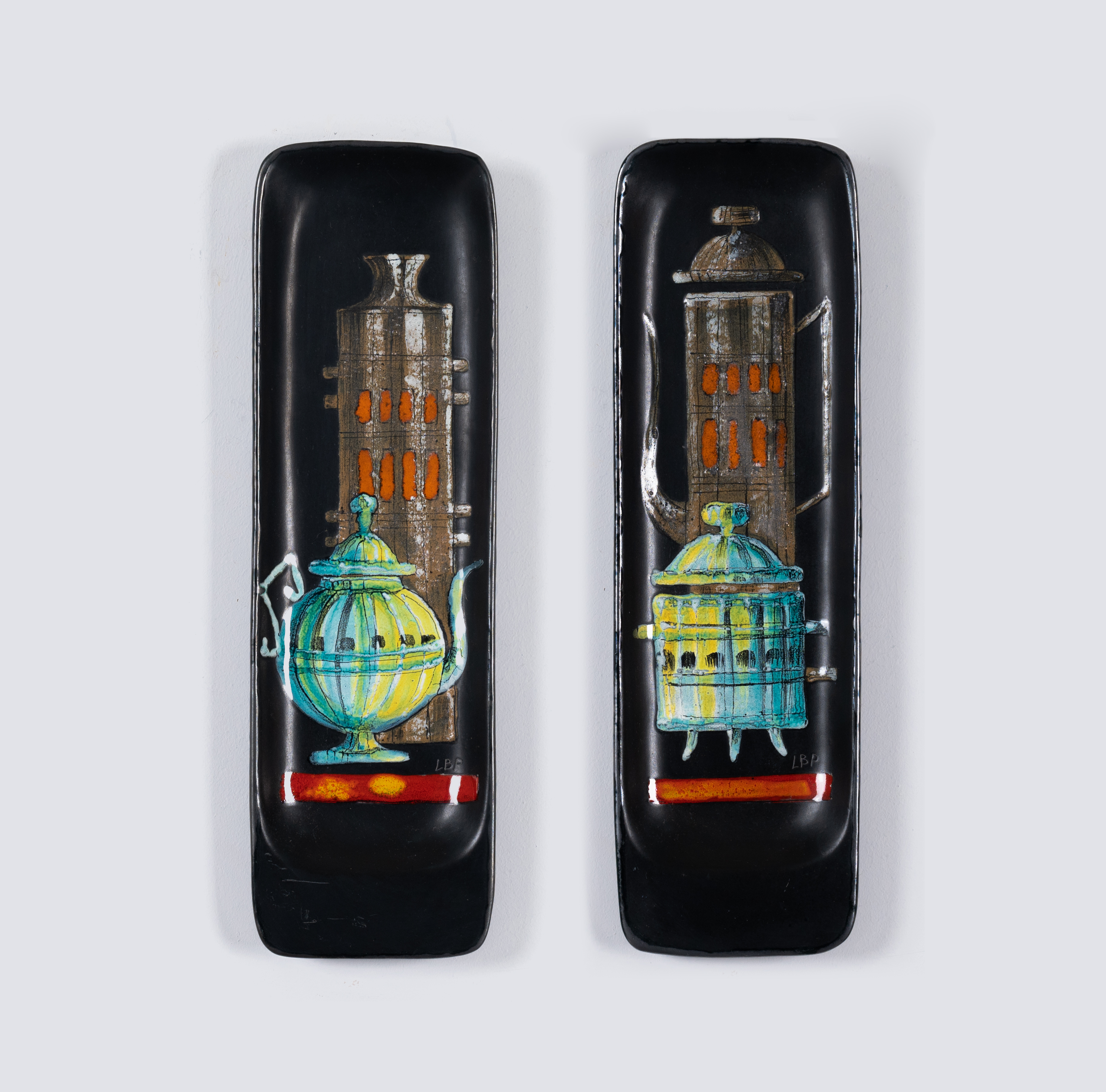Due placche in ceramica decorate con bottiglia, teiera, zuccheriera e caffettiera in policromia su fondo nero. Firma.